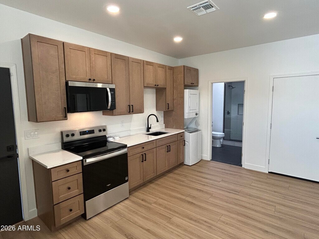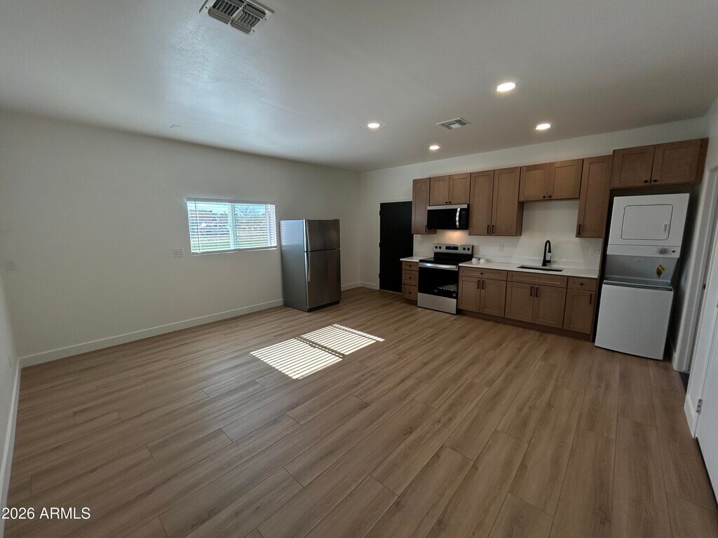 Brand new and beautifully finished,this 1 bedroom,1 bathroom fully remodeled casita sits on a large lot and offers a rare combination of privacy,quality,and tranquility. The home features wood and tile flooring throughout,4-inch baseboards,soaring 9-foot ceilings,and a private entrance. The modern kitchen and bathroom are equipped with quartz countertops,upgraded soft-close cabinetry,stainless steel kitchen appliances,a raised bathroom vanity,and a spacious walk-in shower. The bedroom includes a walk-in closet,and the home comes fully equipped with a refrigerator,washer,dryer,and a new air conditioner for year-round comfort. The property also includes an oversized 8' x 20' garage storage area and is located on a flood-irrigated lot in a very quiet and peaceful area. Pets are negotiable,and water,garbage,and electricity are all included in the rental price,offering exceptional value and convenience. This is an ideal opportunity to enjoy a brand-new,high-quality living space with utilities included in a serene setting.