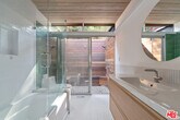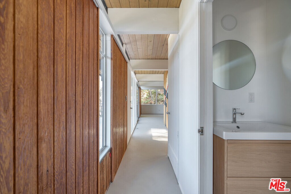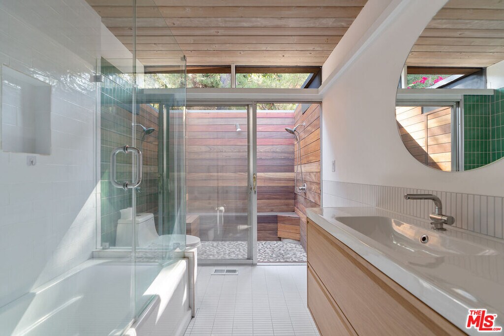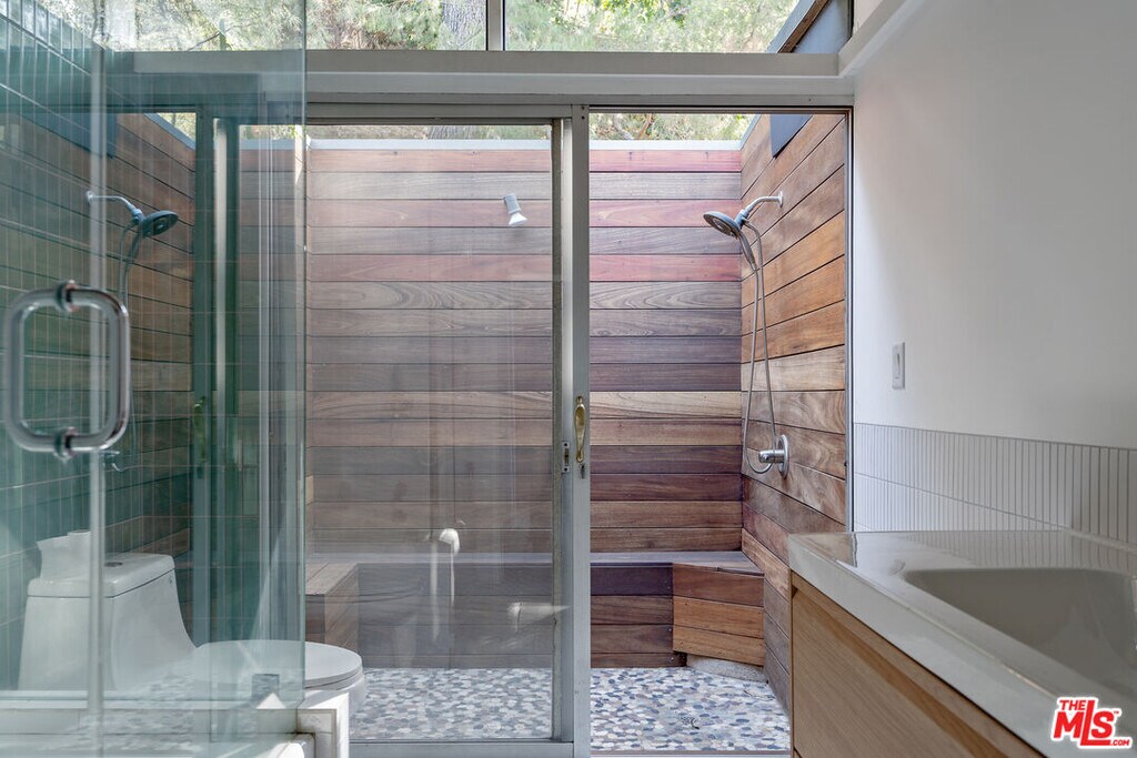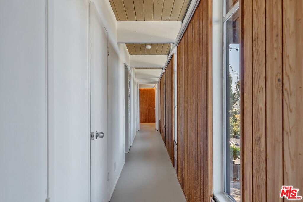 This Mid-Century post and beam home, originally designed by notable LA architect Dick E. Lowry AIA, is rare jewel tucked into the hills of Eagle Rock with stunning panoramic views. A striking profile set against a lush hillside backdrop, wrapped in warm wood siding and anchored by deep black trim, this beauty is bold from the start. Multiple decks spill out from the living spaces, creating a treehouse effect. Inside, walls of glass frame canyon and city views, while post-and-beam ceilings and wood paneling celebrate classic Mid-Century character. Recently redesigned by Yeh Design Lab with reverence for its architectural pedigree, the thoughtful updates imbue the home with a colorful and textural palette. From the brick fireplace surround to the minimalistic cabinet pulls in the kitchen, each element comes together in service of the original architecture. The kitchen is a vibrant mix of custom cabinetry, modern appliances and bold red & blue tile work that transform the space into a work of art. The bedrooms are spacious yet serene, warmed by natural wood and accented with clerestory windows that draw in the light. The bathrooms embrace a spa-like simplicity, including a dramatic outdoor shower framed by wood privacy enclosure. Sited on 3 lots, the home delivers multiple levels of outdoor spaces for entertaining, dining or soaking in the surrounding nature. The separate studio with far-reaching vistas, makes for a great home office, plus ample parking with room for 2 cars out front and 3 additional spots on the lot below. Just minutes from Eagle Rock's vibrant hotspots, this home has it all: prime location, architectural significance and connection to nature. MLS# 25603019