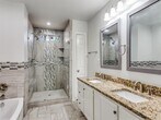 This beautifully updated home features wood-like flooring throughout—no carpet—and fresh paint. The living area highlights an electric fireplace with a marble accent. The kitchen includes granite countertops, a herringbone tile backsplash, unique cabinetry, a mini cooler, stainless steel appliances, and a gas cooktop. The home has gas heating and a tankless water heater. The master suite offers a walk-in shower, soaking tub, and dual sinks with granite. Both the master bedroom and breakfast area open to a backyard patio deck. Additional features include a two-car garage with extra space and a backyard shed for storage. Move-in ready with a spacious backyard!