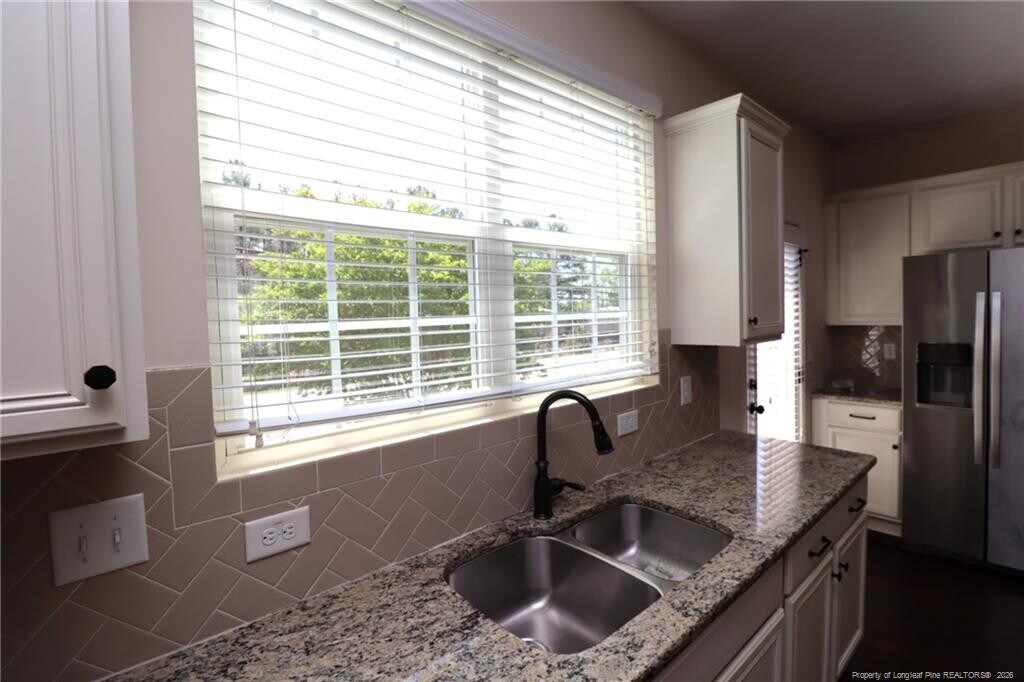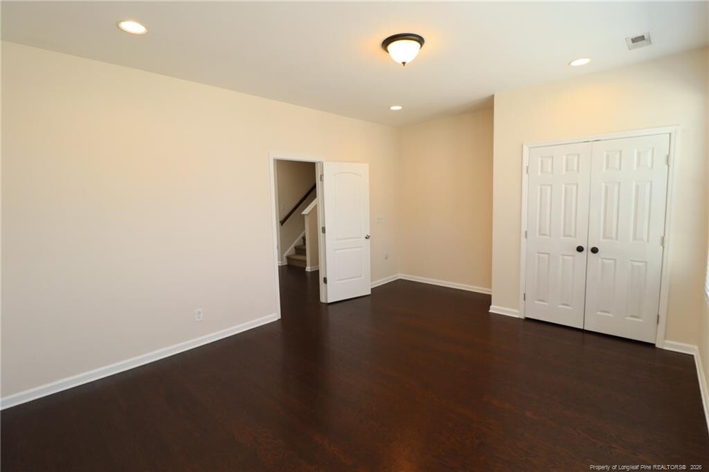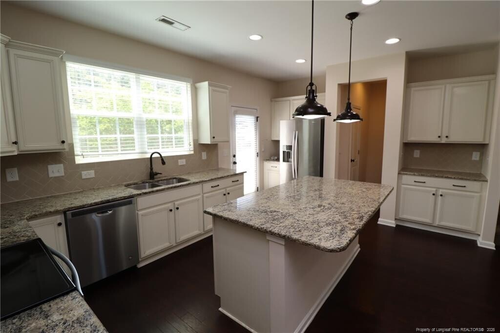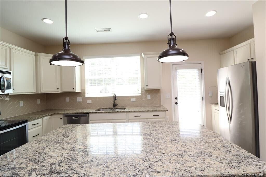 If you've been looking for a dazzling and luxurious townhome that lives large and is ideally located in Apex, you've found your home! 1405 Regents Lane is nestled in the Salem Creek Townhomes community and enjoys a prime location just minutes from downtown Apex, NC-55/I-540, Beaver Creek Commons, local parks and greenways, schools, and so much more. Upon arrival here you'll immediately notice this home possesses a 2 car garage with an equally wide driveway that provides the extra space we all seem to be in need of these days! A covered front porch welcomes you inside to a foyer with a staircase leading both upstairs and downstairs. Take the stairs to the second floor where you're greeted by an open concept living space accentuated by beautiful hardwood floors and recessed lighting throughout; not a stitch of carpeting to be found on this level. This thoughtfully designed space seamlessly blends the kitchen, dining area, and family room—perfectly suited for both entertaining and everyday living. In the back half of the area is the stunning kitchen and is anchored around a large granite-topped island with an integrated breakfast bar and two industrial inspired pendant lighting. You'll also appreciate the white shaker cabinetry, granite counters, custom-tiled backsplash, and a dry bar that provides additional counter space. You will love the sleek stainless steel appliance package which includes a built-in microwave, dishwasher, a smooth-top oven, a refrigerator with a water/ice dispenser and a deep double bowl undermounted sink beneath the dual picture windows. Just beyond the kitchen is the dining area that flows seamlessly into the family room, creating a functional living space. Also located on this level is one of the five bedrooms, complete with 4 picture windows, ample closet space, and easy access to a full bathroom featuring a pedestal sink and a tiled walk-in shower with 3 built-in shampoo niches. The spacious walk-in pantry sits adjacent from the bathroom. Before heading upstairs, be sure to visit the rear deck located just off the kitchen; an ideal spot to relax and unwind. Take a quick jaunt to the top floor and you're greeted by a landing area with a conveniently-located laundry room (including a washer/dryer for resident's use) as well as three additional bedrooms. The primary suite is quite spacious and features two picture windows, a ceiling fan, a TV mount already in place, a walk-in closet, and a luxury en-suite bathroom with a tiled walk-in shower with a bench, an elevated marble-topped vanity with dual sinks, and a private water closet. Bedrooms #3 and #4 are both generously proportioned, offer ample closet space, and easy access to a full hall bathroom with tiled flooring, an elevated vanity, and a tub/shower. Before finishing your tour, be sure you visit the first floor! This space includes direct access from the 2 car garage as well as a massive (and very hard to find) 5th bedroom with an en-suite full bathroom and a walk-in closet. If you're not in need of a 5th bedroom, this space could be put to use as a home office, exercise area, study, rec room, media/game room, etc.; the possibilities are endless.