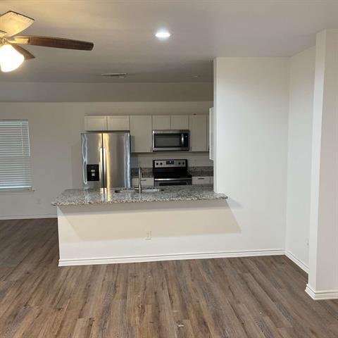 Spacious 4-Bedroom, 2-Bathroom Home with Stylish Upgrades and Huge Backyard! Welcome to this stunning and affordable 4-bedroom, 2-bathroom home with a spacious 2-car garage, designed for comfort and functionality. This home features a large open-concept layout that seamlessly connects the kitchen and living areas, enhanced by architectural ceilings in both the living room and primary suite for a sense of openness and elegance. The kitchen is beautifully finished with trendy white cabinetry, granite countertops with breakfast bar seating, a stylish backsplash, stainless steel appliances, and a large pantry—ideal for any home chef. Luxury waterproof vinyl plank flooring runs through the living areas and bathrooms, while plush carpet adds warmth to the bedrooms. The private primary suite includes a raised ceiling, walk-in custom closet, and en suite bath. Thoughtful details continue throughout the home, including a separate utility room with a folding and hanging cove, and custom closets for added storage. Step outside to a massive fenced backyard featuring a covered patio, lush new grass, and mature trees—perfect for relaxing or entertaining. Located in a quiet, family-friendly neighborhood, this home offers incredible value and style. Don't miss this one—schedule your showing today!