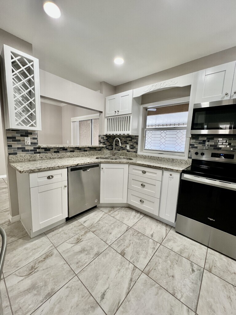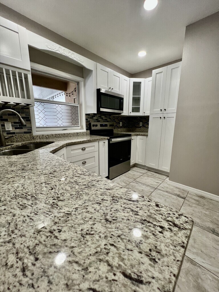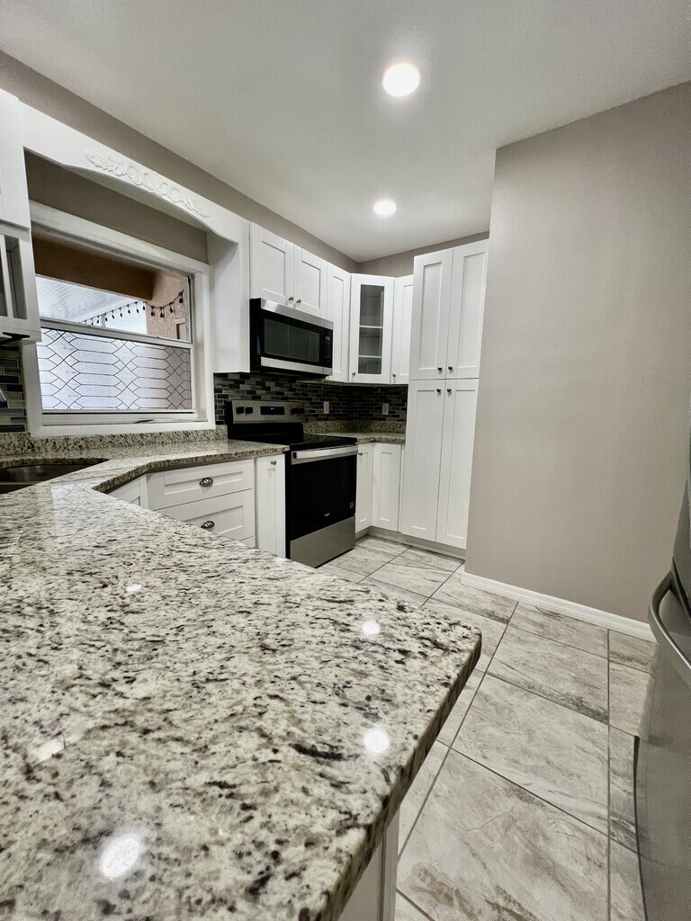 COMPLETELY RENOVATED!! Move-in ready! This desirable townhouse in Meadow Pointe in gated Subdivision of Sedgwick. 3 bedrooms each with their respective private bathroom. On the First Floor you have a lovely dining room/ kitchen with ceramic tile floor, white wood cabinets, ample granite counter tops/ breakfast bar, glass backsplash, stainless steel appliances, new dishwasher, glass cooktop, large under stairs storage. First floor also has an updated hall, full bathroom, one bedroom with a laminate floor that can be used as Den/Study, Living room with beautiful laminate floor, new lighting and ceiling fans. The Second Floor has the washer and dryer, master bedroom with walk-in closet, ensuite that has a shower and tub. Another bedroom with lots of closet space and bathroom. It also includes a huge covered/screened in Lanai Patio with storage closet. 2 parking spaces. Enjoy the beautiful community clubhouse with pool, tennis, splash pad, playground, volleyball, and Fitness center and School Shopping and Hospitals and more. No pets please.