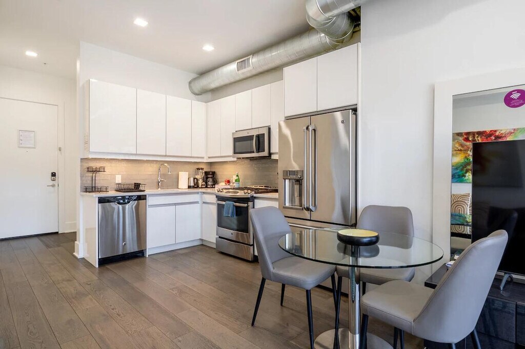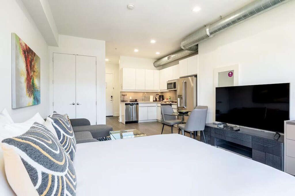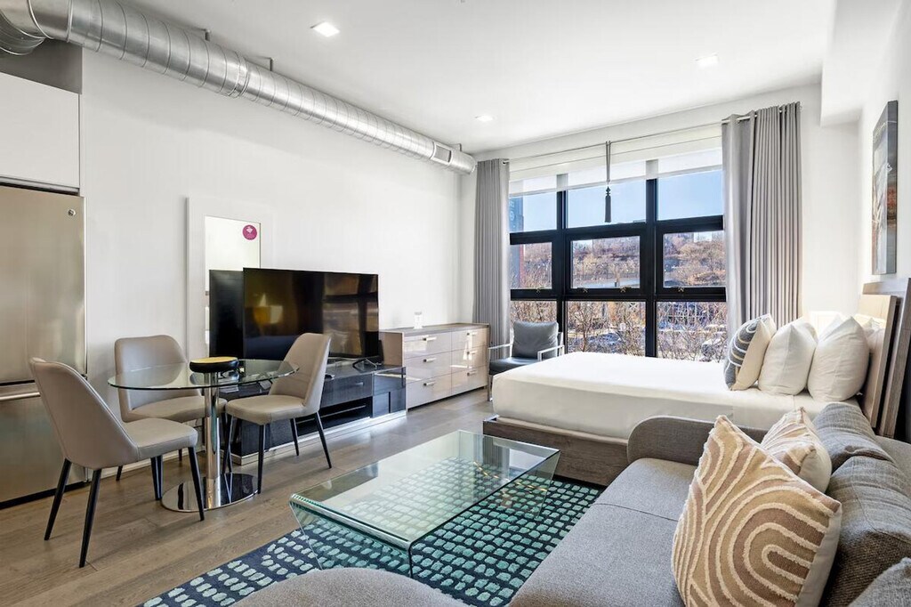 Feel at home in this fully furnished studio apartment located in the vibrant community of Hoboken, New York Metro Area. This charming studio offers an astonishing sunset view of New Jersey from its floor-to-ceiling windows and serves as a perfect alternative to a 1-bedroom suite, ideal for couples and conscious business travelers. The apartment is thoughtfully designed to cater to your needs, featuring a well-decorated space with modern furnishings. Enjoy the convenience of a fully equipped kitchen and a cozy living area, all crafted to make you feel at home. The apartment offers 24-hour check-in for your convenience. Nestled in Hoboken, this apartment offers easy access to the lively surroundings and attractions of the New York Metro Area. The building includes an on-site Real Hot Yoga studio for fitness enthusiasts and a rooftop terrace on the 7th floor, providing spectacular views of Hoboken and Manhattan. Smoking is strictly prohibited inside the property and apartments, including all enclosed areas. Violating this rule may result in a penalty of up to $500 to cover deep cleaning, deodorizing, and any damage caused. Security cameras operate 24/7 in exterior areas of the building for the safety and peace of mind of all guests. The rooftop is a shared space accessible by all guests staying in the building. The units can be located on the third, fourth, fifth, or sixth floor. Please do not move furniture from its current spot inside the apartment, as it can cause damage to the items.