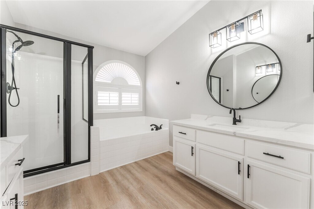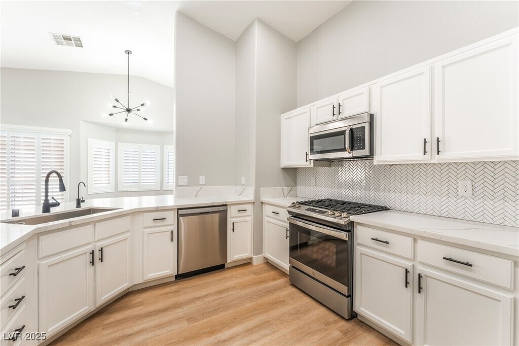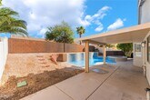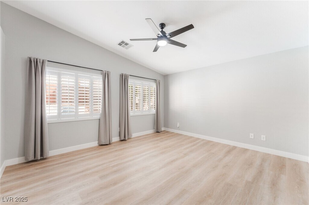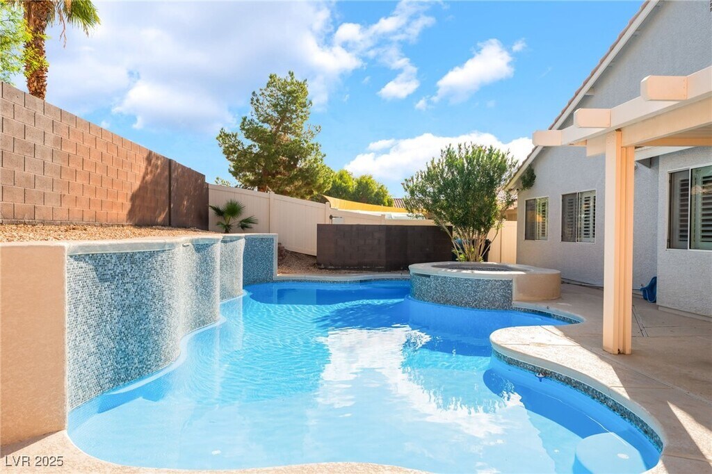 **MARKETING SPECIAL - 2 WEEKS FREE IF LEASED BY 10/15/25** This beautifully upgraded single-story home sits at the head of a peaceful cul-de-sac & offers 4 beds, 2 baths, & a 3-car attached garage with an extended driveway. Throughout the home, you'll find luxury vinyl plank flooring, custom plantation shutters to help keep the Vegas heat at bay, vaulted ceilings, & a gas fireplace in the oversized great room. The updated kitchen features modern appliances, quartz counters, bar counter seating, & a walk-in pantry. The private primary suite is thoughtfully separated & includes double sinks, a separate tub, & a separate shower. Step outside to a rare private backyard with an updated, low-maintenance desert landscaping, a large free-form pool with waterfalls, a relaxing hot tub, & a shaded patio area perfect for outdoor dining & grilling. Privacy security double doors at the entry & convenient access to Nellis AFB, major freeways, popular dining, & Shadow Creek Golf Course.