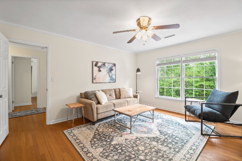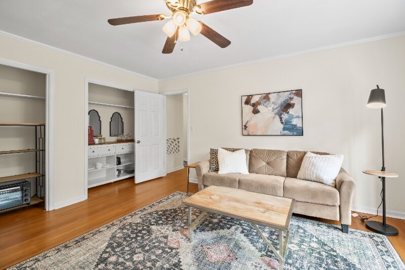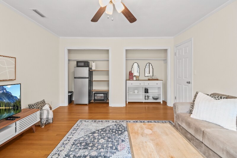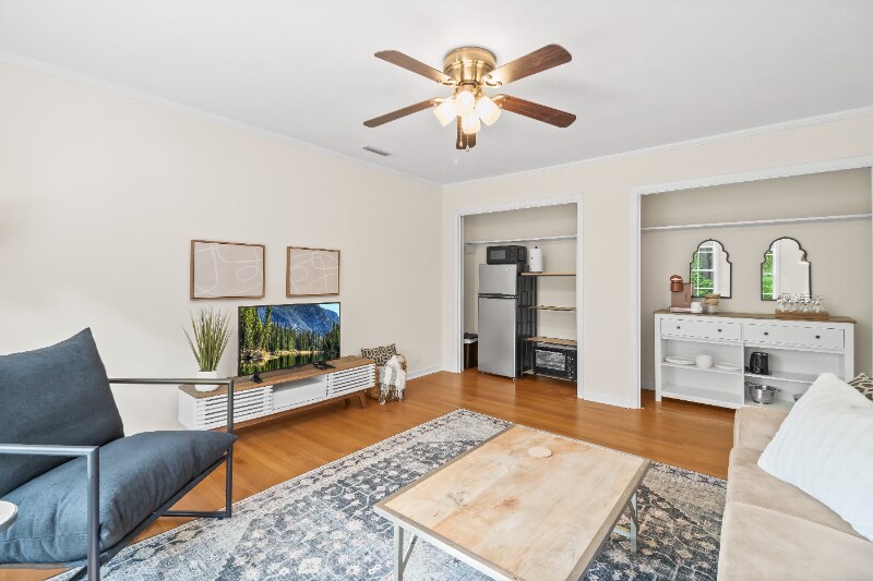 Property Id: 1813679 Wake up with a fresh cup of coffee overlooking a beautiful backyard before getting the day started. Welcome home to this fully furnished 1 BR/1 BA with separate living room, kitchenette and full, private, bathroom. Downstairs hosts a separate working space with a desk and a private patio overlooking the peaceful backyard. Upstairs you'll find a bright and sunny living room with large smart TV, and a clean cozy throw blanket. Kitchenette with fridge, freezer, Keurig coffee maker, microwave, dishes, glassware, cutlery, etc. Across the hall is a serene separate bedroom with queen bed, two nightstands, blackout curtains, large closet with hangers, and ceiling fan. Bathroom is well equipped with bath and hand towels. Starter supplies of soap, toilet paper, paper towels, trash bags, etc. included. Monthly allowance for laundry service is included as this unit does not have washer/dryer.