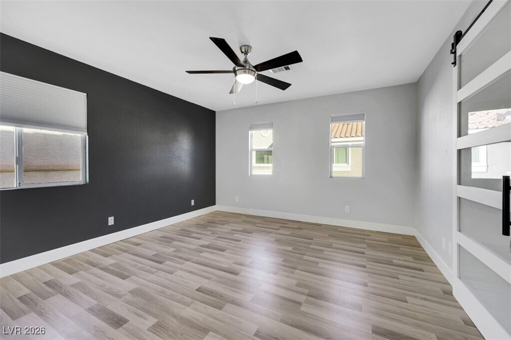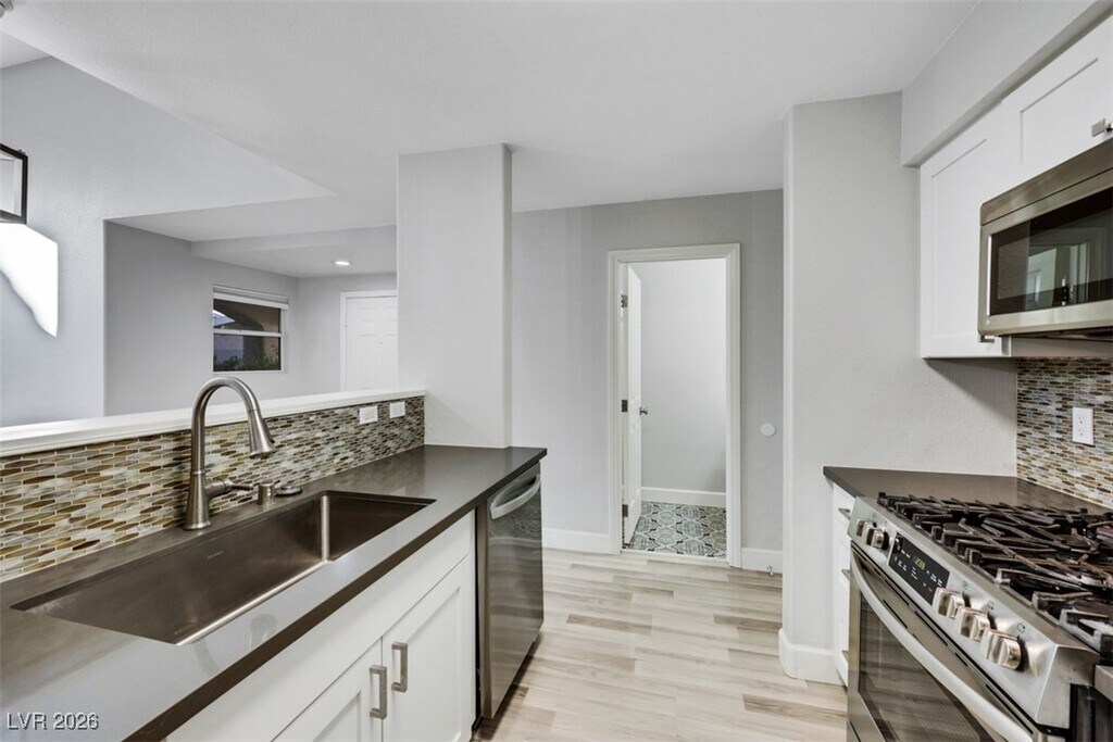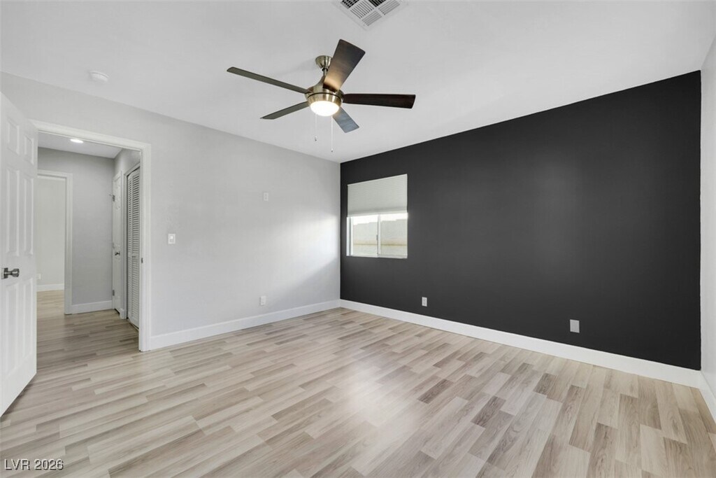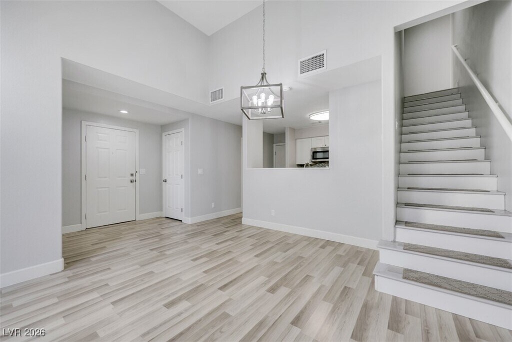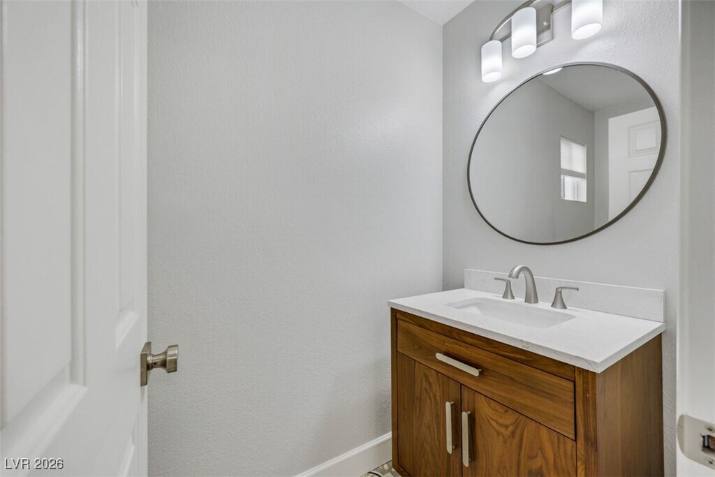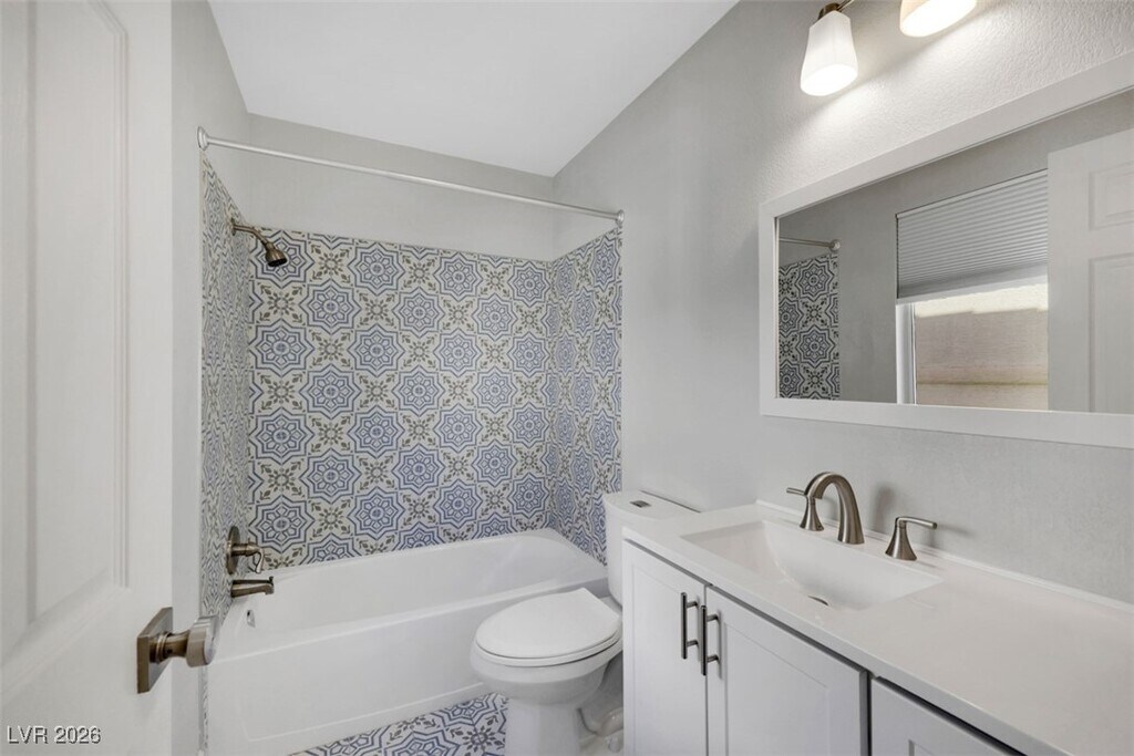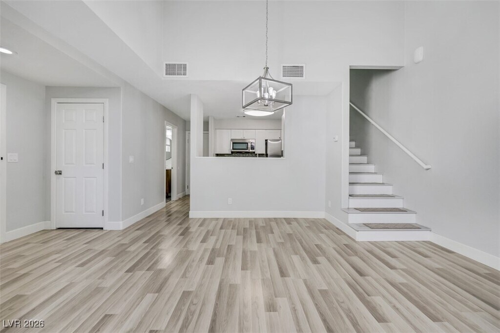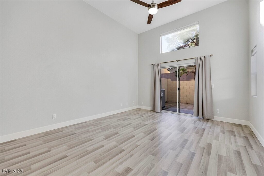 Welcome Home! Completely remodeled two-story single-family home with two primary suites, 2.5 bathrooms, a two-car garage, and a community pool & spa, located in west Las Vegas near Summerlin amenities. The main level features an open living and dining area with vaulted ceilings, updated flooring (no carpet!), and abundant natural light. The remodeled kitchen offers white cabinetry, stainless steel appliances, modern finishes, and opens directly to the living space. A downstairs powder room includes an updated vanity and fixtures. Sliding doors from the living area lead to a private, fully enclosed backyard with low-maintenance landscaping and patio space. Upstairs, both primary suites include private ensuite bathrooms and closets with built-in shelving. Bathrooms are finished with custom tile surrounds, updated vanities, and modern fixtures. Laundry upstairs between bedrooms. **We are looking for minimum 650 credit, $5k income and no less than 2 excellent landlord references.**