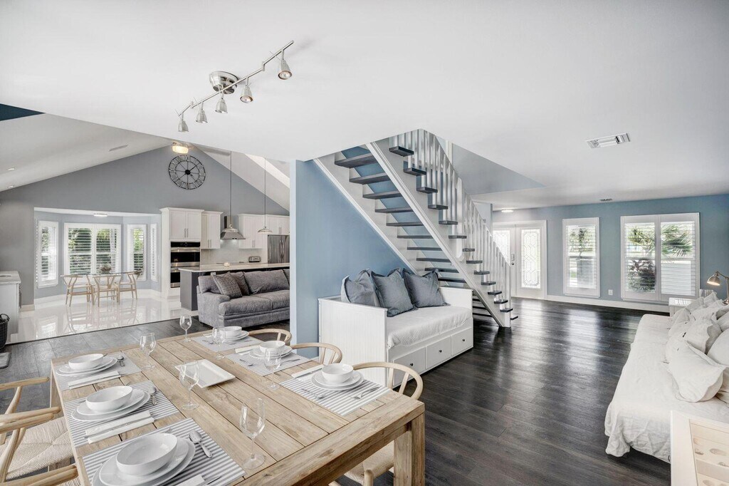 Bring the family and enjoy the Florida Lifestyle! Spectacular waterfront home on the Loxahatchee River with Ocean Access! Pack your clothes and your boat up to 24' in this active boating community! Gorgeous Open concept kitchen with beautiful quarts counters, custom cabinetry & stainless appliances. 3 double sliding glass doors off the living space, high ceilings and skylight for plenty of natural sunshine! Paddle Boards, Kayaks, Golf Clubs, Bikes & Water Toys available for your enjoyment! Stunning water views from the private pool deck & from the balcony off the primary bedroom. Putting Green in the back yard with night lighting. Beds: King (2nd fl primary), Queens (2nd & 3rd) & Twins (4th). Close to fine restaurants & shopping!