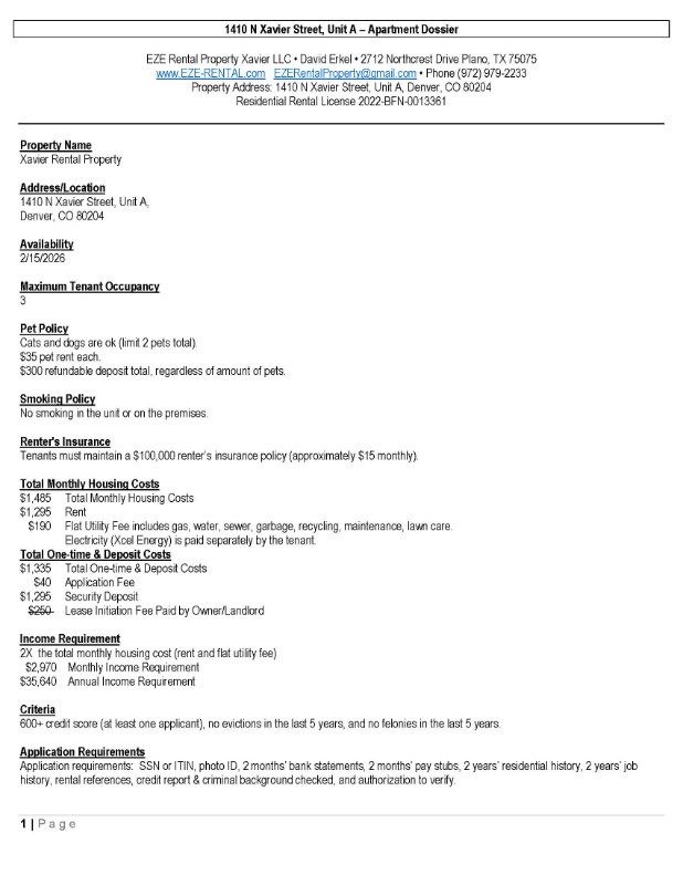 The rental at 1410 Xavier St is currently listed at $1,295.