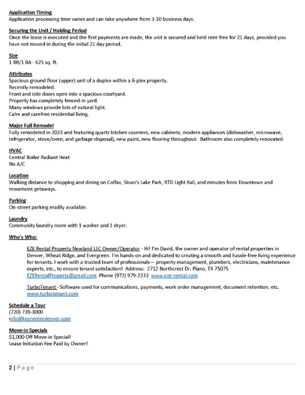 Property Id: 1593695 Move-in Specials $1,000 Off Move-in Special! $250 Lease Initiation Fee Paid by Owner! Schedule a Tour This spacious 1-bedroom, 1-bath 625 sq. ft. upper level apartment of a duplex located in a well-maintained 6-plex near Sloan’s Lake, the Arts District, and Colfax dining and transit. With only 1 neighbors below, this unit offers a quiet and carefree residential living. The property is fully fenced in. Fully remodeled in 2023 and featuring quartz kitchen counters, new cabinets, modern appliances (dishwasher, microwave, refrigerator, stove/oven, and garbage disposal), new paint, and new flooring throughout. Bathroom also completely renovated. Laundry available in community laundry room, on-street parking readily available. Cats and dogs welcome (up to two total). Total Monthly Housing Costs $1,485 Rent $1,295 Flat Utility Fee includes gas, water, sewer, garbage, recycling, maintenance, lawn care. Electricity (Xcel Energy) is paid separately by the tenant. $190 Total One-time & Deposit Costs $1,335 Application Fee $40 Security Deposit $1,295 Lease Initiation Fee Paid by Owner $250 See "Apartment Dossier" document for more information.