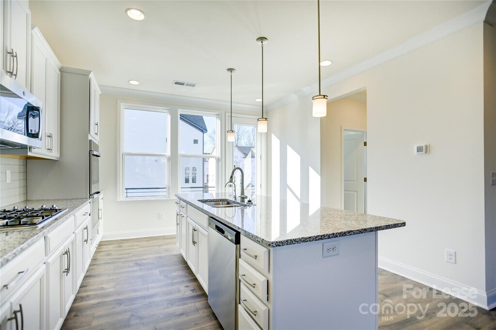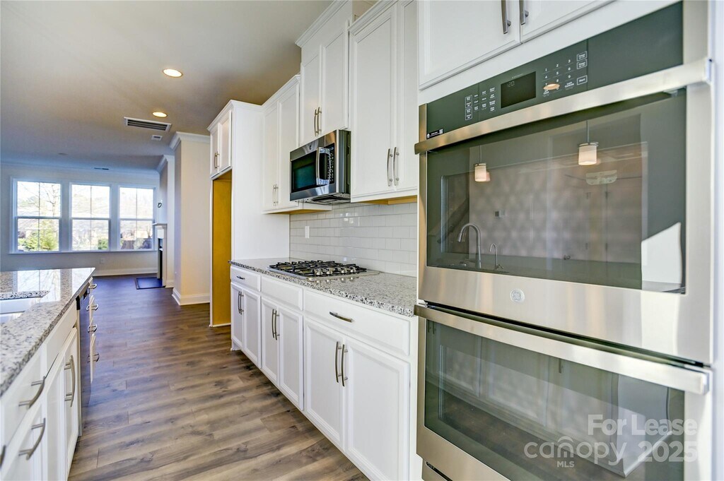 END UNIT Townhome in Ballantyne's "Elm at Stonecrest" Community. Open concept with tasteful upgrades. Enjoy the convenienve of a first level bedroom and full bathroom,perfect flex space for an office,or for overnight guests to enjoy the privacy of their own floor. On the next level - the main living area - you will find the gourmet kitchen featuring white cabinets,granite countertops,a gas cooktop,double wall ovens,crisp white subway tile backsplash,and a large island. Enjoy morning coffee or outdoor meals on the deck,accessed off the kitchen,and the bright,open great room with vented gas fireplace is perfect for everyday living or gathering with family or friends. Retreat to the primary suite on the upper level,featuring a trey ceiling,large walk-in closet,and spacious ensuite bathroom with large,tiled walk-in shower. The upper level is completed with two additional guest bedrooms,a full bathroom,and laundry closet. Large two-car garage. Great Ballantyne community with abundant shopping and dining amenities nearby!
