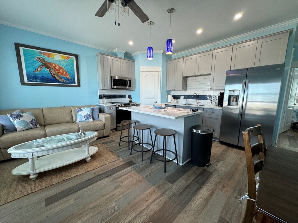 Fully furnished downstairs unit just one block from the Seawall—perfect for effortless coastal living. This beautifully maintained residence features an open-concept layout with a modern kitchen,quartz countertops,stainless steel appliances,and a spacious island with seating. Light-filled living area flows seamlessly into a private bedroom and a stylish bathroom with a walk-in tiled shower. Coastal finishes throughout create a bright,relaxed beach vibe. Enjoy easy access with no stairs,plus a charming shared outdoor space ideal for relaxing after a day at the beach. All bills paid,including utilities and internet,making this a truly turnkey option. Located close to dining,shopping,and Galveston attractions. Ideal for those seeking a move-in-ready home near the water with comfort,convenience,and style. MLS# 20580636