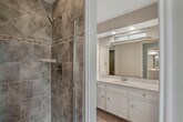 This three-bedroom, three-bathroom home offers approximately 2,300 square feet of living space. The primary bedroom features a spacious bathroom with a tiled shower and a separate jetted bathtub. The home also includes a fireplace, a kitchen with an island, a large living room, and a breakfast room. Outdoor amenities include a backyard, a patio, and a large tree in the front yard. The property provides a sizable garage and a big backyard, offering ample space for various activities.