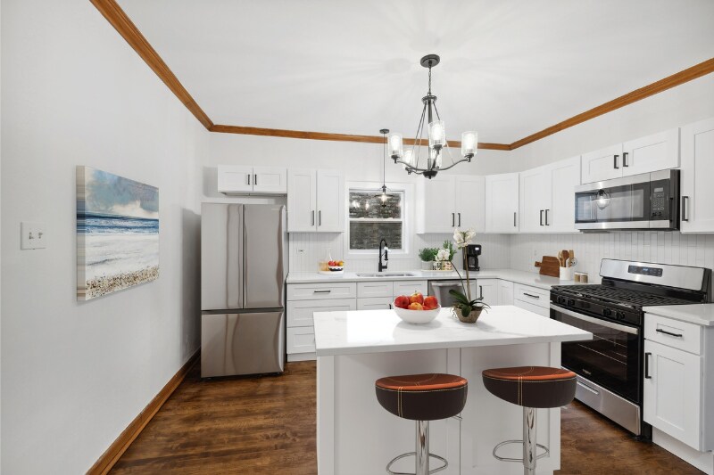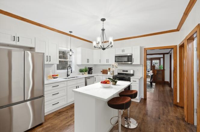 Property Id: 2409967 Beautifully renovated and truly move-in ready home with all the original details of a classic bungalow. The all-brick structure has been lovingly restored with refinished wood floors, trim and doors. Gracious living room has original built-ins that open into the dining room. Brand-new kitchen features white cabinets, quartz countertops and stainless appliances. New bathroom has a restored cast-original tub and new fixtures. Three bedrooms on the main level. Full walk-out basement has been freshly repainted and fully tiled; perfect for a family room and game room. Large backyard has a stamped concrete patio and plenty of green space.