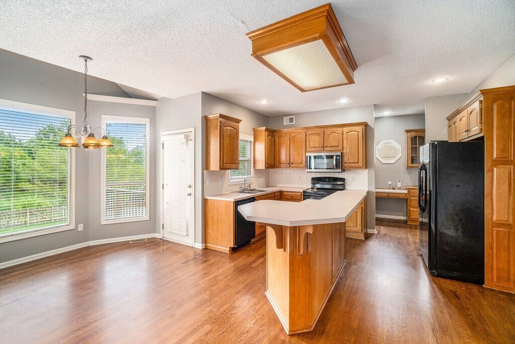 Great home in desirable Blue Valley school district. You will enjoy the sunny, open floor plan. You are greeted with wood floors from the foyer through the half bath and the entire eat-in kitchen. The breakfast nook looks out on the spacious, fenced back yard with large deck. Backyard rear gate takes you to your walking trail leading to neighborhood lake and park. The family room with lots of windows and fireplace is in full view of the kitchen. The master suite has oversize bathroom with double vanities, tile floors, & garden tub. The secondary bedrooms share a hall bathroom. The finished basement and many extras!,..walking trails behind home, & community pool.