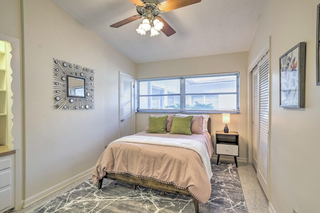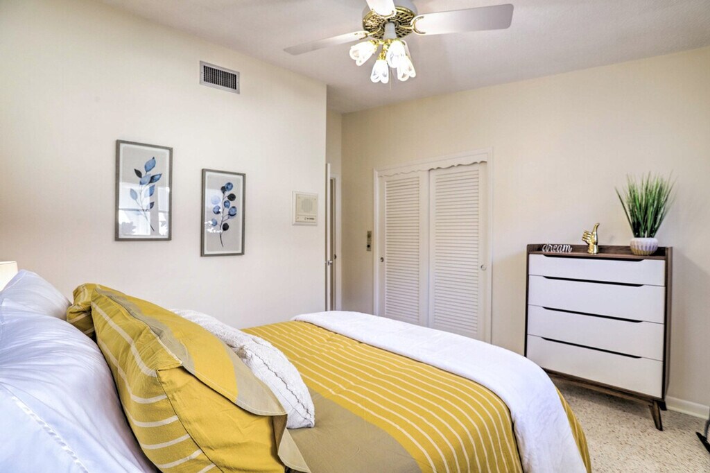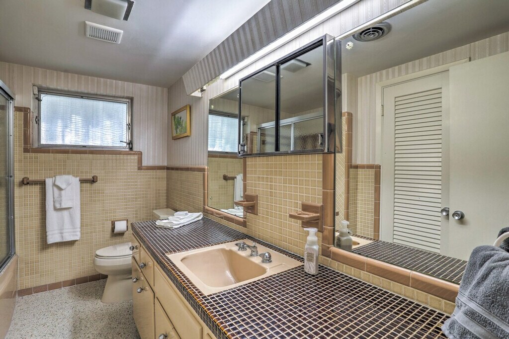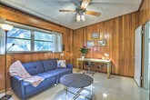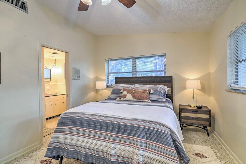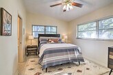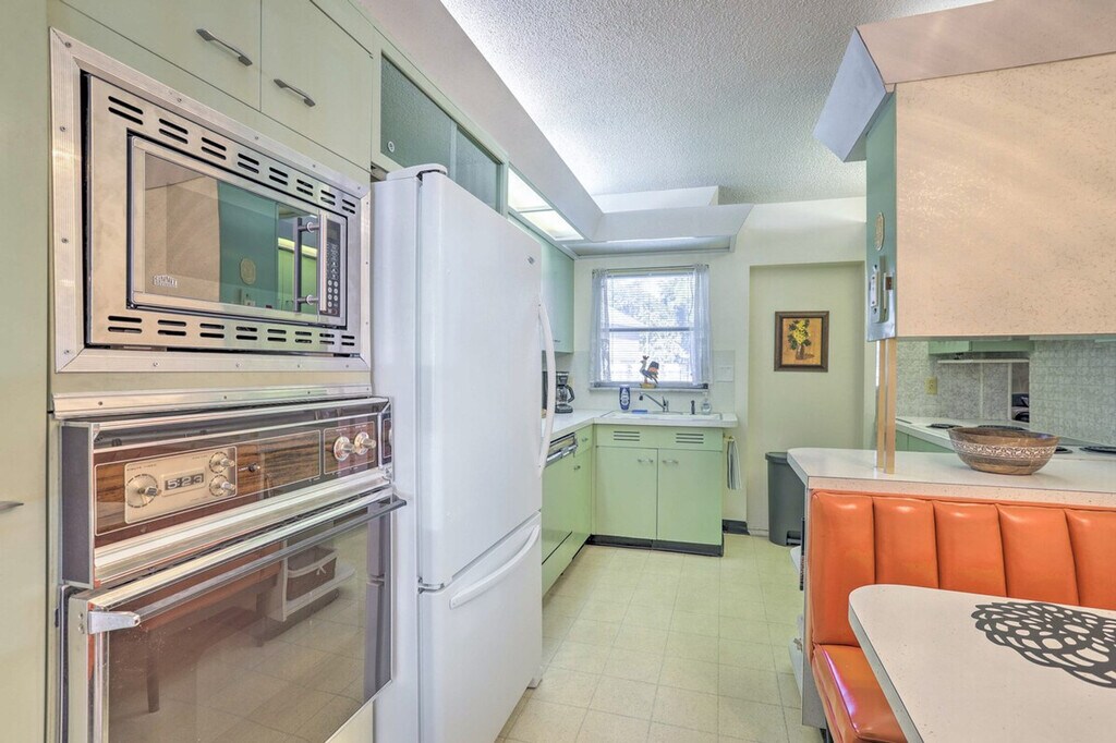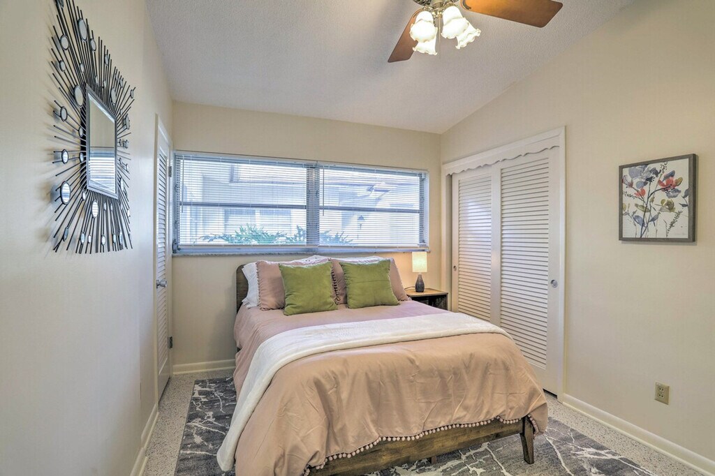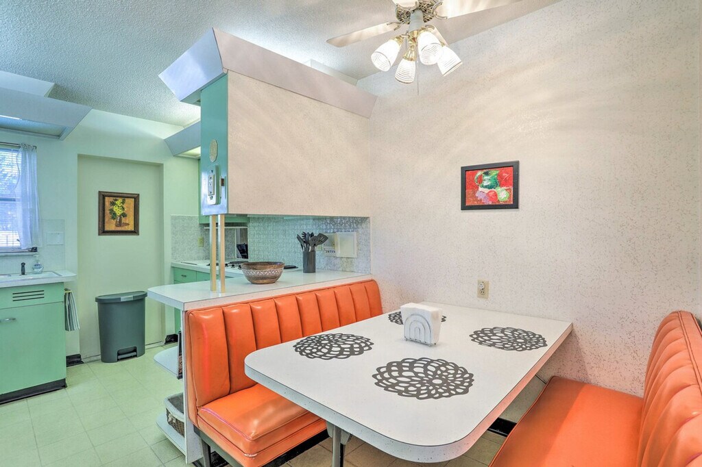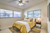 Feel at home in this retro-style 3-bedroom, 3-bath vacation rental in St. Petersburg. This home requires two steps to enter. This home features a full kitchen with all major appliances including a dishwasher, coffee maker, and blender. Enjoy the smart TV, fireplace, desk, books, dining table, and en-suite bathroom. Linens, towels, a washer/dryer, hangers, central heating, air conditioning, and ceiling fans are provided. Enjoy the heated pool and fenced-in patio with outdoor seating and a dining area. Pool towels are provided. Garage parking for one vehicle and driveway parking for two vehicles are available, along with a Class II EV charger. This is a pet-friendly property with a $150 pet fee. Grab your swimsuits and lather on your sunscreen for fun-filled days in the sun. Head out for a fun-filled day at Sunset Beach, visit John's Pass, or explore Sunken Gardens, all just a few miles away. Quiet hours are observed from 10:00 PM to 9:00 AM. The guest house entrance is on Bogie Ave and the homeowner's primary residence is on-site with a separate entrance on Country Club Rd. A double interior door is shared and locked. The backyard is also shared, but a pool safety fence separates the homeowner's yard and the guest area. The homeowner may be present during your stay. There is one exterior security camera that overlooks the pool into the homeowner’s portion of the yard. The camera is outward facing and does not look directly at the pool or into interior spaces. The camera does not actively record video or sound. Guests must be at least 25 years old to book. No events, parties, or large gatherings are permitted. [SI]