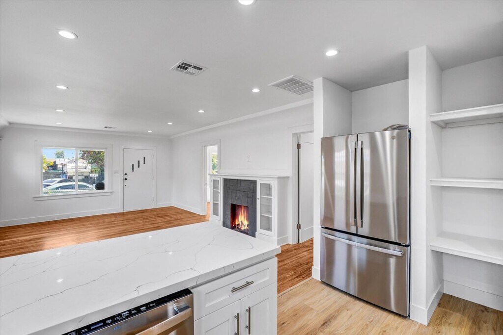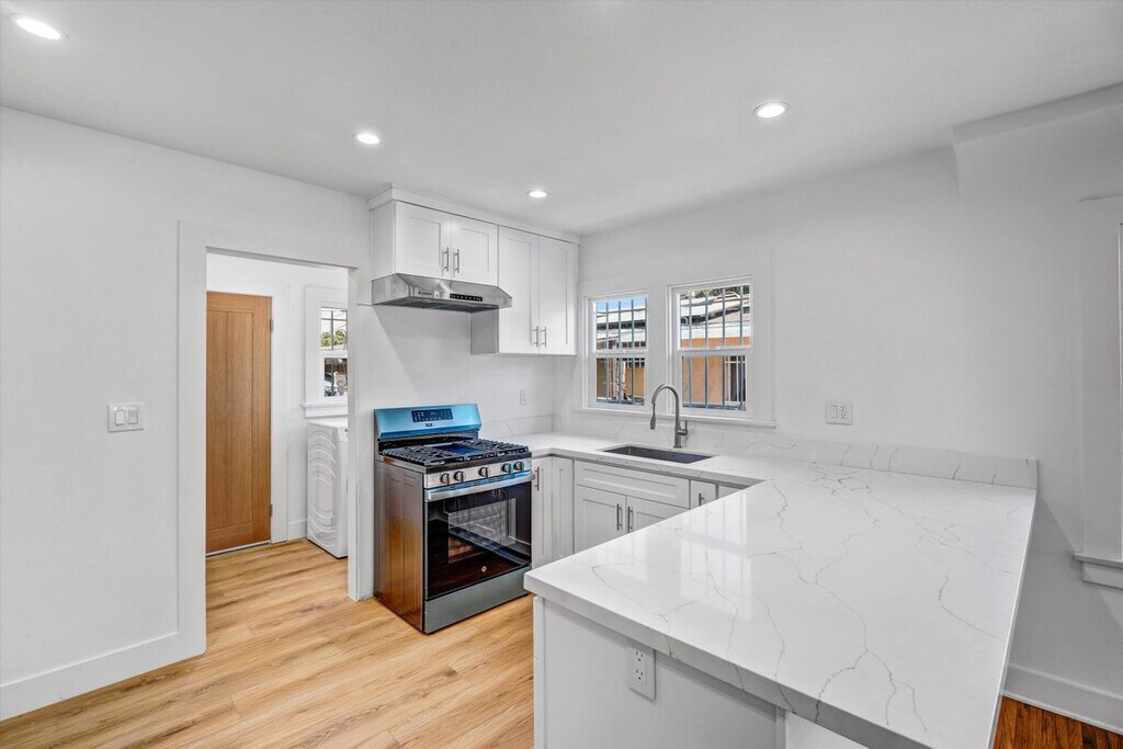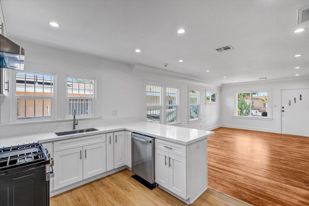 Welcome to the best LEASE in the entire neighborhood at 1413 E 76th Pl, Los Angeles, CA! This lovingly renovated single-family residence offers an exquisite living experience with its thoughtfully designed features and modern upgrades. Spanning 1,008 square feet, this home boasts three spacious bedrooms and two completely remodeled bathrooms, ideal for family living or entertaining guests. Step inside to find stunning hardwood floors that flow seamlessly throughout the main living areas, complemented by elegant tile floors in the bathrooms. The heart of the home is the chef's kitchen, showcasing a total renovation with top-of-the-line appliances, including a gas stove and dishwasher, making it a culinary enthusiast's paradise. The living room features a cozy fireplace, perfect for relaxing on cooler evenings. The home is equipped with central heating and cooling, ensuring comfort year-round. For your convenience, there is an in-home washer and dryer, streamlining your daily routines.Security is a priority, with a security gate and advanced security system installed, providing peace of mind for you and your loved ones. This property combines modern amenities with classic charm, creating an inviting atmosphere that you will love coming home to.Located in a vibrant Los Angeles neighborhood, this residence offers both comfort and style. Don't miss this exceptional opportunity to lease a piece of Los Angeles living at its finest. Schedule a viewing today to experience all that this impressive home has to offer!