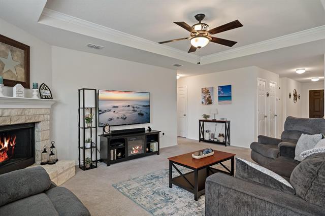 Spacious 3-bedroom, 2-bath home with a 2-car garage and an open floor plan. The kitchen features ample cabinet space and a center island, perfect for cooking and entertaining. The primary suite includes a private ensuite bathroom with a separate shower and a relaxing soaking tub. The living room offers a tray ceiling and a cozy fireplace, creating a warm and inviting atmosphere. Enjoy a fenced backyard with a patio—ideal for outdoor gatherings. This home is light, bright, and well-maintained. No smoking permitted. Renters insurance is required. Property is currently occupied through April 30.