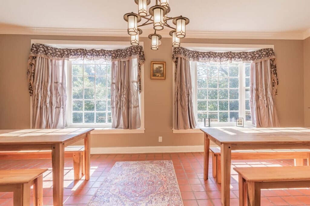 Feel like royalty in this one-of-a-kind Midtown castle! This 6-bedroom, 4-bathroom home delivers on style, comfort, and location. Please note that the driveway is inaccessible due to construction, and the roof and one upstairs king-size bedroom are under maintenance and closed to guests. Upon entry, you'll be greeted by a 26' high wood-vaulted ceiling, stone walls, a winding staircase, and ornate details. The main level features an open living room with two oversized sectionals and a large flat-screen TV complete with Roku. The main level also boasts a full kitchen with a new double oven and gas cooktop. Tons of windows and natural light shine into the kitchen, making cooking an enjoyable experience. Sliding glass doors open to a patio. A giant formal dining room with two large tables can accommodate the most sizable families. The main level bedroom is the king-size bed master suite with a private bath and walk-in closet. Ascending the gorgeous staircase to the home's upper level, guests will enjoy two generously sized bedrooms that share a Jack and Jill bathroom. In the home's lower level, you'll find ample room for entertaining and another full bathroom. Sleeping options are abundant, with two more bedrooms and a small seating area with a twin over full bunk bed as well as a sleeper sofa. The walk-out basement provides guests access to a fantastic yard with mature trees and landscaping, which give a sense of privacy. Fireplaces are decorative only and not for guest use. A pack 'n play/travel crib and a vacuum are available upon request. A pack 'n play/travel crib is available upon request. Located in Midtown Columbus, this home is perfectly situated to explore 18 different historic neighborhoods! Enjoy coffee at Midtown Coffee (a local favorite) just a half-mile away! A 5-minute drive will take you to family-friendly Lake Bottom Park, the Coca-Cola Space Science Center, and the National Civil War Museum. Fort Moore is a quick 20-minute drive with easy access to the highway. The home is located in a residential area, so driving is recommended; however, Uber and Lyft are readily available. This home does have a steep staircase that may be challenging for small children or guests with mobility issues, and there are also two upper-level balconies to consider if you're bringing small children. Quiet hours are observed between 10 PM and 7 AM. If our cleaning crew reports any signs of smoking cigarettes, vapes, e-cigs, pipes, etc. (smell, ash, etc.) in or around the home, an automatic $500 damage charge will be incurred. The same charge applies if cigarette butts are found outside of the home. If marijuana is smoked in or around the home a $500 fee will be charged, and details about the reservation may be turned over to the appropriate authorities. Parties are prohibited at the home. If we are made aware of a pet on the property, a deep cleaning fee of $500 will be charged and guests will be required to depart immediately with no refunds given. Registration Number: STVR-11-23-7359 [SI]