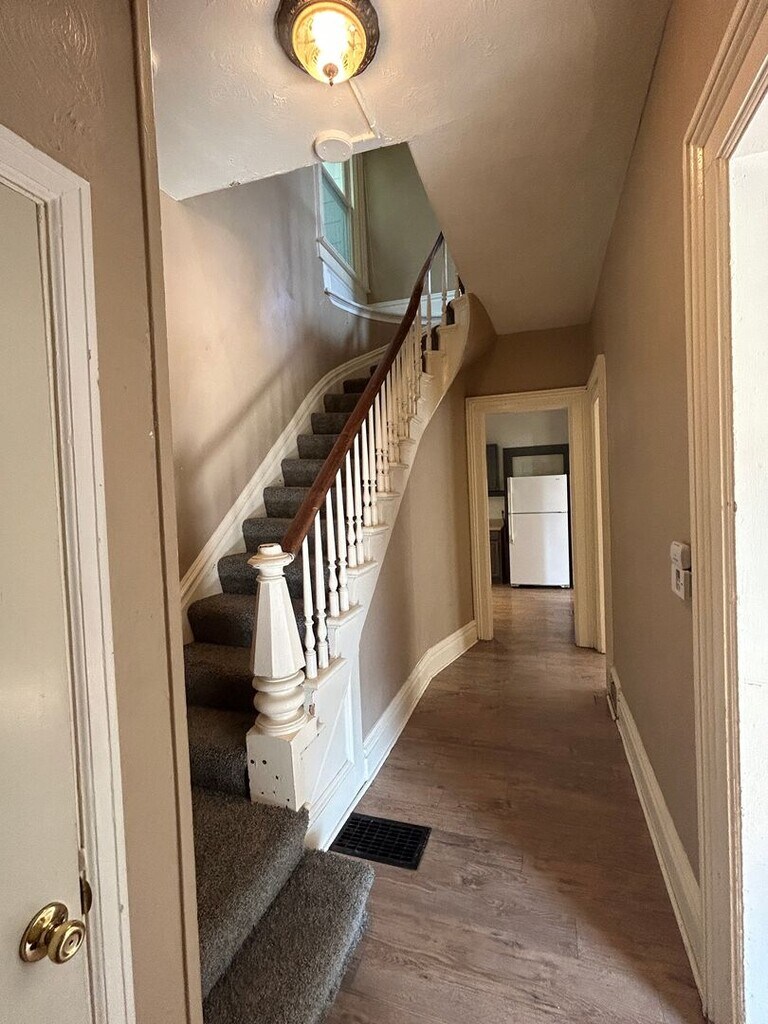 Two story 3 bedroom, 1.5 bathroom home with kitchen appliances including refrigerator , stove/oven and dishwasher . Generous sized rooms. Laundry has been moved up to one of the 2nd floor bedrooms for convenient laundry access. Tenant pays all utilities and is responsible for lawn care. Call to schedule a showing or visit to apply.