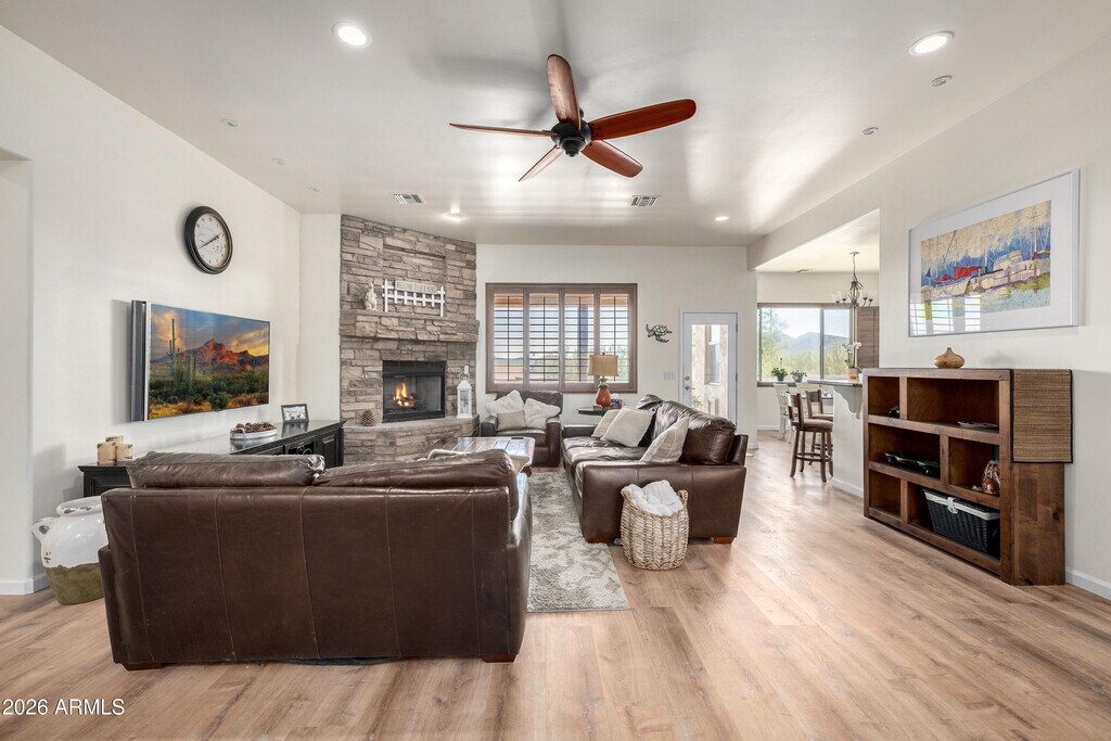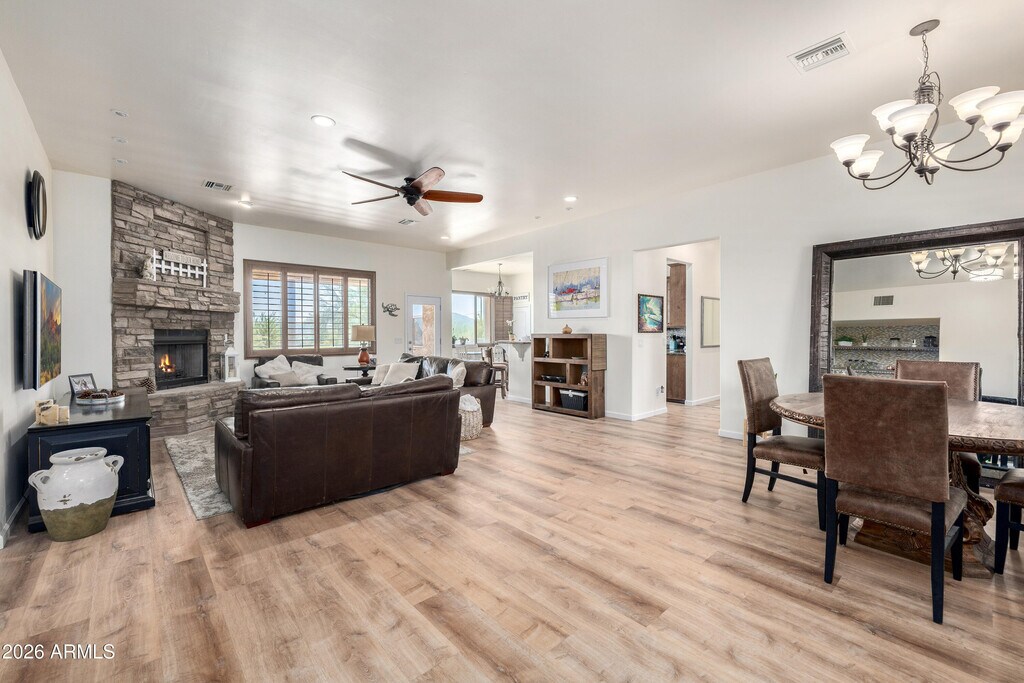 Robyn BernzottBeautifully updated 4-bedroom, 3.5-bath home featuring a desirable split floor plan and open-concept living. The chef's kitchen includes a new cooktop, dual ovens, and generous prep space -- ideal for entertaining. Enjoy cozy nights by the fireplace or gather around the backyard fire pit with built-in seating under the Arizona sky.Two RV gates provide room for your RV, boat, side-by-side, and more. The 3 oversized garage bays offer built-in cabinetry, a workstation, and additional storage -- perfect for hobbies or projects --A seamless blend of refined desert living and functional outdoor space!