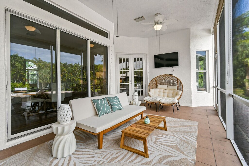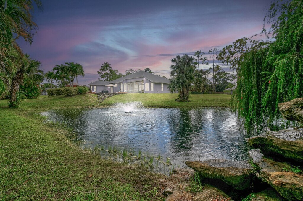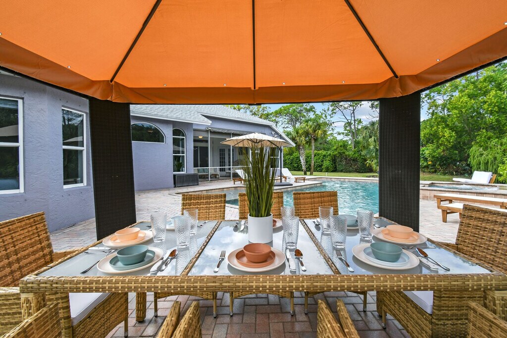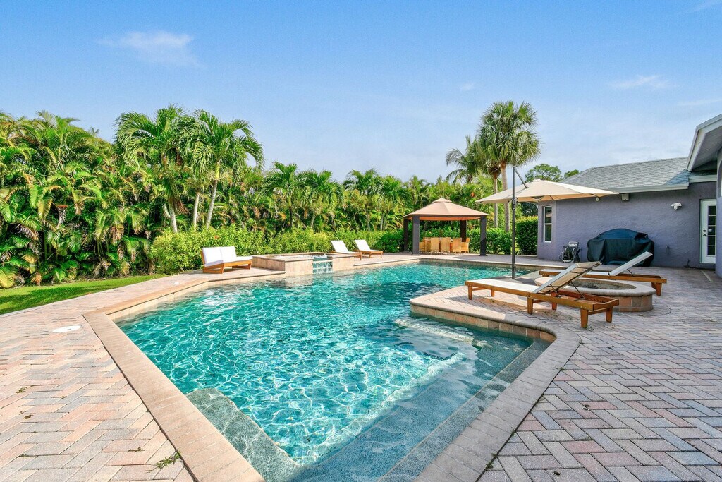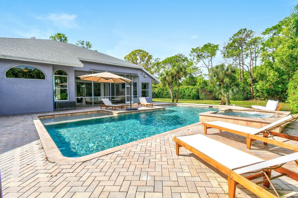 Feel at home in this luxurious 4-bedroom, 3-bathroom home with an office (including a queen pull-out sofa) in Palm Beach County. This tech-savvy oasis sleeps 10 and is situated on a 1.15-acre fenced lot, offering a peaceful retreat with panoramic views. This almost 3,000 sq ft home features a split floor plan, smart home features, a heated pool, an LED-lit waterfall hot tub, a fire pit, a screened Florida room, an oversized gazebo, and a private pond. The recently updated kitchen is fully equipped with new appliances and thoughtful touches. Enjoy the 85" smart TV, ample seating, and charming décor in the expansive living area. The outdoor dining area includes a gas grill and ample seating for al fresco meals. RV parking is available. Located just a 20-minute drive from PGA Boulevard, you'll have access to a variety of restaurants and activities. Additionally, the property is only a 30-minute drive from the area's stunning beaches, offering even more opportunities for adventure and relaxation. There is a minimum age requirement of 27 years old to book the property. Prior authorization is needed for more than 2 visitors at one time who are not listed as guests. Music must be kept low and end by 8 pm outdoors; it should not carry beyond the front gate. Smoking is strictly prohibited inside and will result in a $500 fine if violated. Guests are responsible for cleaning the grill and kitchen oven after each use and before check-out, or a cleaning fee of $150 will be deducted. Unauthorized guests may lead to the immediate cancellation of your reservation without a refund. Outdoor music must be kept low and not extend beyond the property boundary, and no music is allowed outside from 8 pm to 8 am. Disturbances may lead to immediate removal without a refund. Absolutely no confetti or glitter is allowed anywhere on the property, and if found, an additional cleaning fee will be applied. Check-in is between 3 pm and 10 pm only. Security cameras monitor the outdoor perimeter and driveways, and if cameras are tampered with, the property owner reserves the right to visit the property to fix the issue. Beach essentials, including towels, chairs, and umbrellas, as well as a high chair and pack-n-play are available. Registration Number: 000031475, [SI]