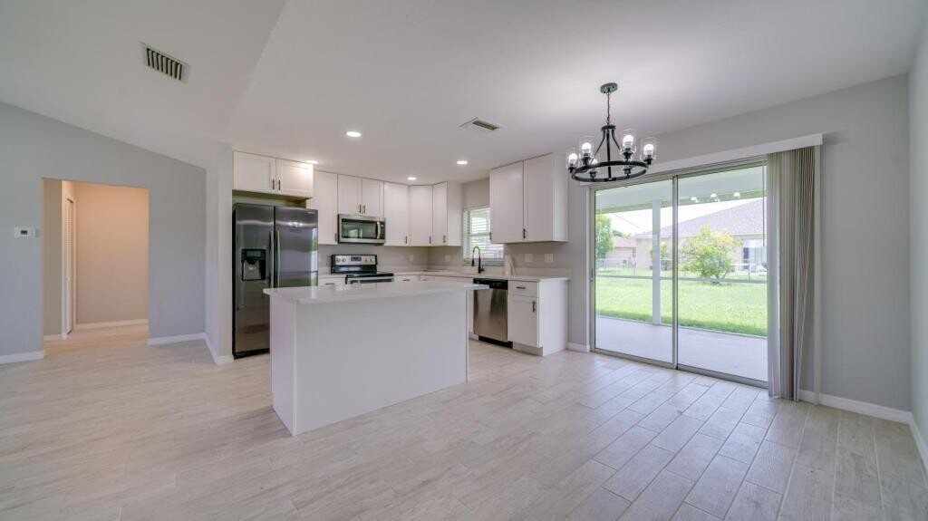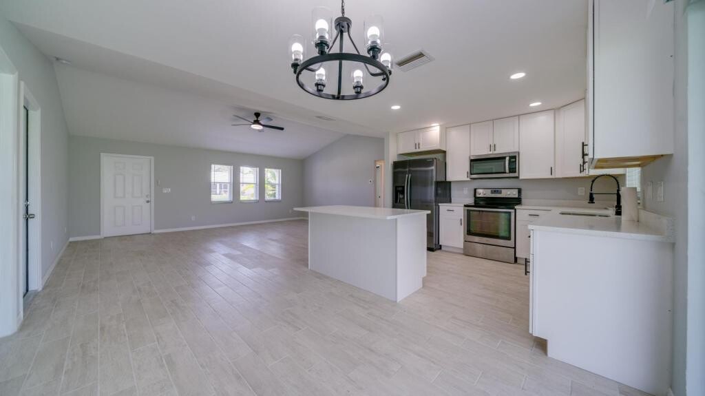 Come check out this CENTRALLY located home in the HEART OF CAPE CORAL with a FULLY FENCED in yard! Just minutes to everything that you need, this freshly renovated property is beckoning a new family to call it home. Beautiful WOOD-LOOK TILE floors span throughout the OPEN concept great room, making it easy to entertain friends and family. Cooking is simple with NEW stainless steel appliances, modern shaker style cabinets and sparkly quartz counters. Relax in the fully SCREENED-IN lanai and enjoy the spacious FULLY FENCED backyard and convenient 2 car garage (electronic door opener will be installed.) Ask us about our MOVE-IN SPECIAL! Schedule your personal tour today before this home goes. Lawn care and Pest Control will be taken care of by the owner. *Owner will be installing a new garage door opener as well as a washer and dryer at time of move-in*