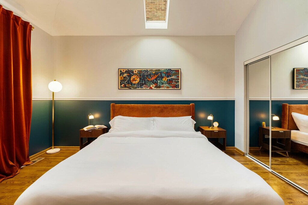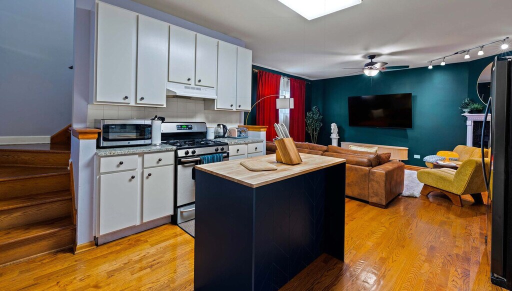 Feel at home in this luxurious and spacious apartment, nestled in the heart of the city. As soon as you step inside, you'll be struck by the open floor plan and sleek design. The living room is the perfect place to relax and unwind, with plush couches, a fireplace, and a 75” flat-screen TV. The gourmet kitchen is fully stocked with cooking utensils, pots, and pans, and ready for your culinary creations, with top-of-the-line appliances and plenty of counter space. Entertainment options include a pool table, Pacman arcade machine, and Roku streaming devices with HBO Max, Netflix, Disney Plus, and Hulu. There is also a 65” TV in the bedroom. Coffee and tea are provided. Two parking spaces are available. This apartment is conveniently located, 15 minutes from Downtown Chicago, 20 minutes from O'Hare International Airport, 17 minutes to Navy Pier, 16 minutes from Millennium Park, 18 minutes to the Field Museum, and 16 minutes to The Art Institute of Chicago. Quiet hours are between 10 PM and 8 AM. No parties and no smoking are allowed. There is a $500 smoking fee. A coin washer and dryer are located right outside the unit. Registration Number: R2 [SI]