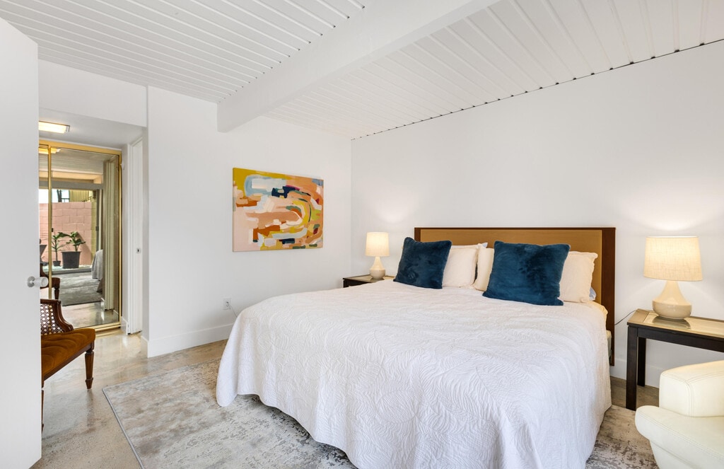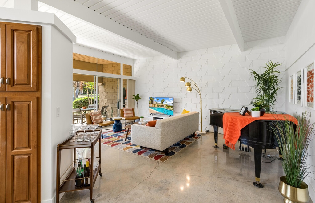 Here's your chance to experience one of the first William Krisel designs built in Sandpiper,Palm Desert. This mid-century modern features classic mid-century modern architectural details,including exposed concrete block walls,clerestory windows,and tongue & groove ceilings wood plank ceilings throughout. Natural light from the wall of windows in the living room brightens this home,and the east-facing patio offers serene views of the greenbelt,palm trees,and mountains. This home features beautiful,easy-to-maintain polished concrete floors and an updated kitchen and bathrooms. The kitchen is well-equipped and offers a gas range,a microwave/range hood,and everything you need to prepare a delightful meal to be enjoyed on your patio dining table. A cocktail cart is ready for you to serve up cocktails and wine pre-dinner. Located within walking distance of the finest shopping and dining in Palm Desert,including the fabulous Shops on El Paseo the ''Rodeo Drive of the Desert'' you'll have easy access to some of the best restaurants in the area. And many of the area's best hiking trails are just a few minutes away. Monthly Rental Rates: January - April $5,000,May $4,000,June - September $3,500,October - December $4,000.