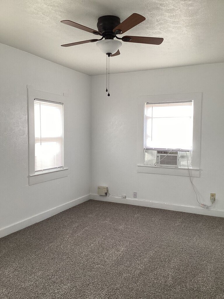 Welcome to this charming 2-bedroom, 1-bathroom home located in the vibrant community of Portales, NM. This home has been freshly painted and features a spacious, fully fenced backyard, perfect for outdoor activities. The interior boasts a comfortable living room with LVP flooring, a kitchen and bathroom with durable linoleum, and cozy bedrooms with new carpeting. The home is equipped with a refrigerator, an electric stove/oven, and eat-in kitchen, and washer and dryer hookups for your convenience. For your comfort, the home is fitted with ceiling fans, a gas wall heater, and window A/C units. The property also offers off-street parking and blinds on all windows for added privacy. This home is pet-friendly, subject to owner approval and a $25 monthly pet fee per pet. The lease term is flexible, ranging from 6 months to 1 year. Please note that tenants are responsible for electric, gas, and water utilities. Don't miss out on this lovely home in Portales, NM.