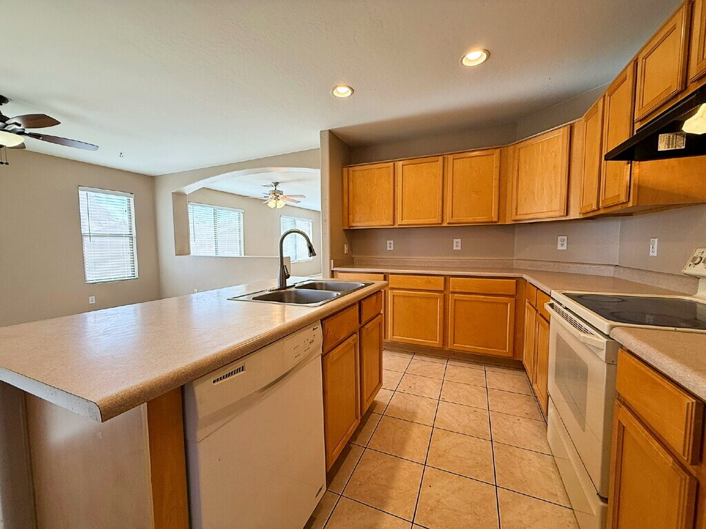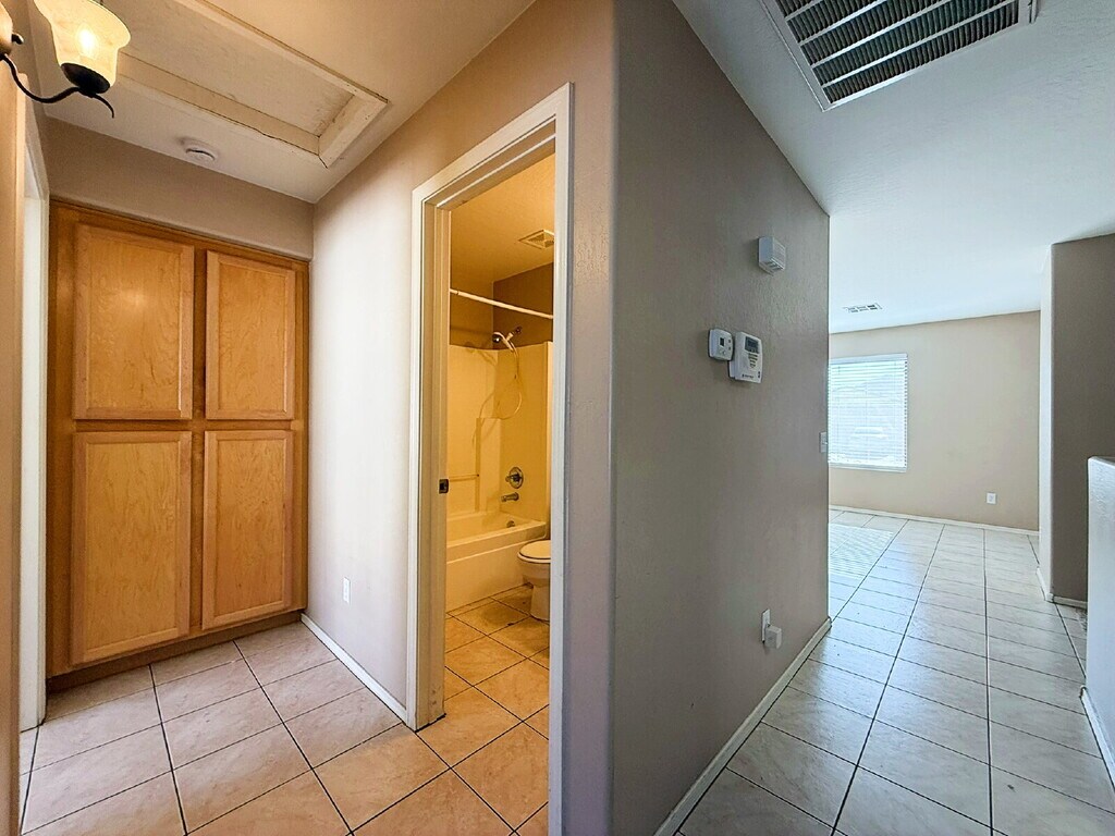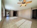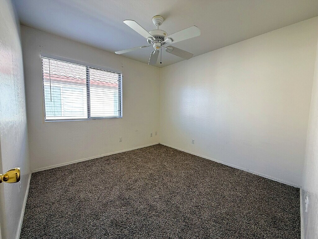 This 3-bedroom, 2-bath + Den home offers 1,558 sq ft of comfortable living space with an open floor plan, tile and carpet flooring, and a functional kitchen featuring an island, pantry, and ample cabinet space. The primary suite includes a private bath and walk-in closet. Enjoy a covered patio, low-maintenance desert landscaping, and a fully fenced backyard—perfect for relaxing or entertaining. Attached 2-car garage. Community amenities include pools, parks, and walking paths, with convenient access to schools, shopping, dining, and the Loop 303. Full interior paint to be completed after holidays.