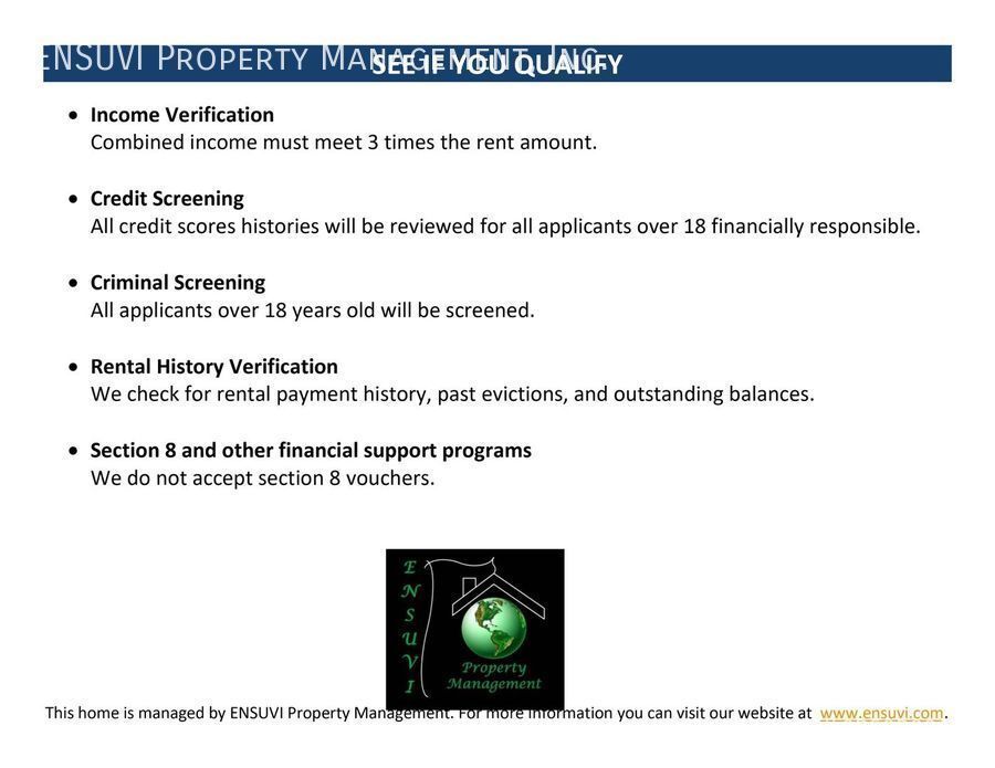 ***PLEASE direct all inquiries to .*** The security deposit is equal to 1.5 month's rent (no last months’ rent deposit is required). NO PETS PERMITTED. A non-refundable $95 background fee is charged for each applicant 18 years old or older. Additional HOA fees may apply. Tenant liability insurance is required and can be purchased through your insurance carrier or can be obtained through our affiliate insurance company for an additional monthly cost. This property is currently not registered within the Section 8 program. If you have any questions or would like to schedule a viewing, please send a message through this website. If you would like to apply, please go to our available listings at
