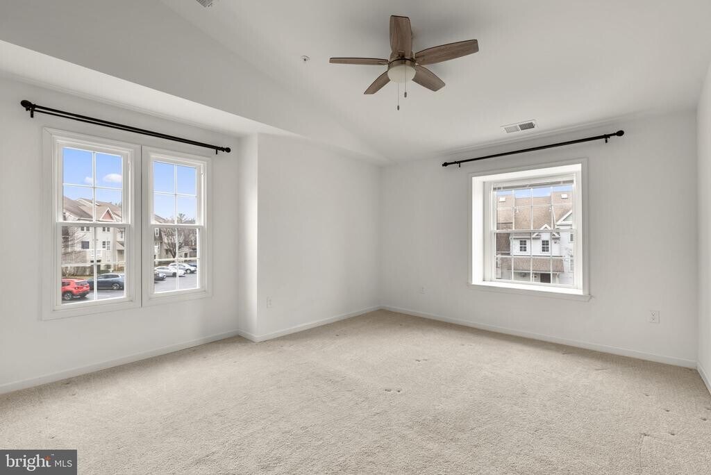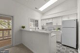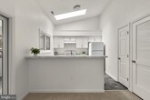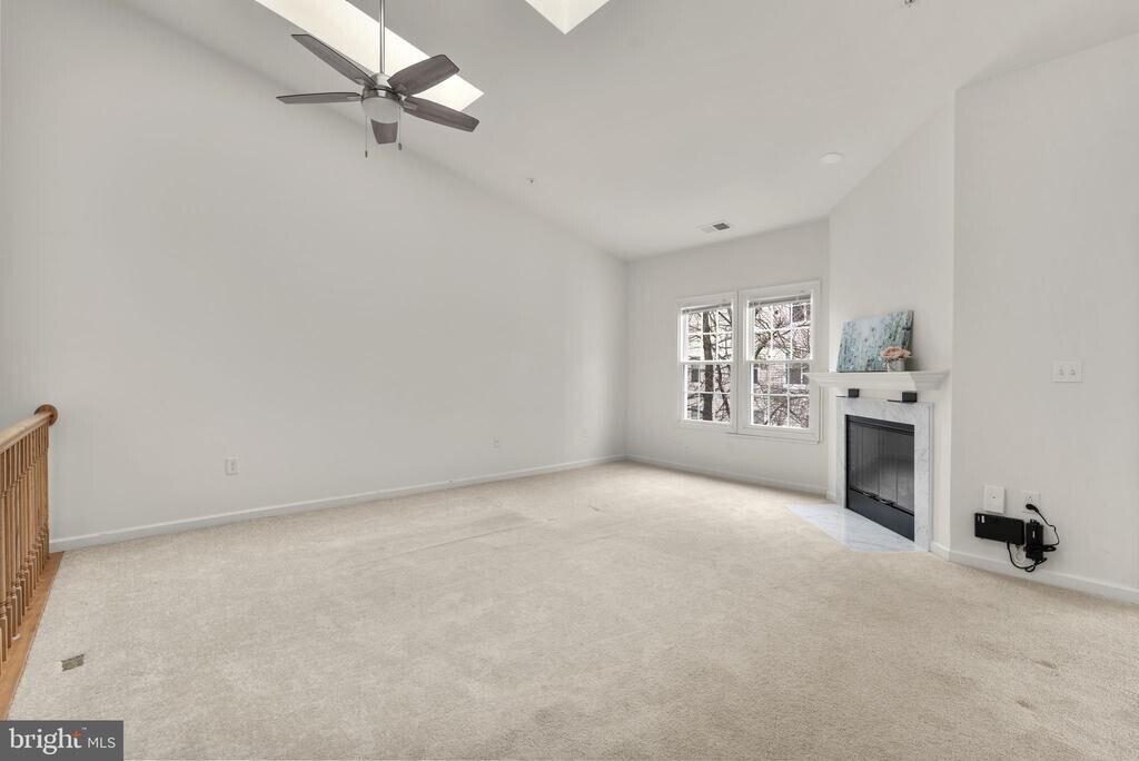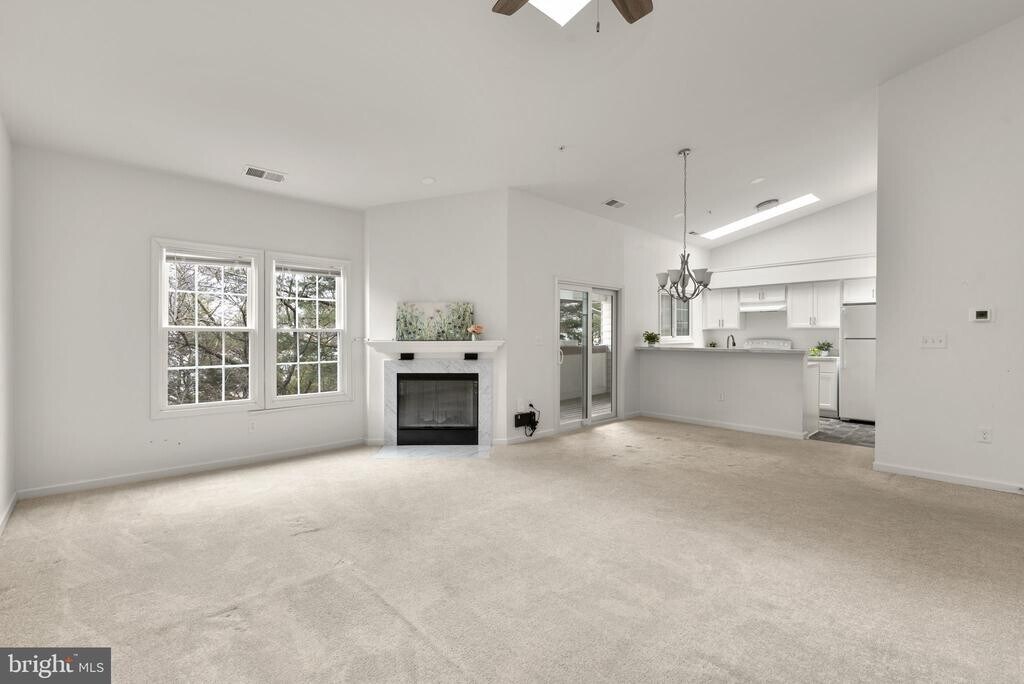 Contemporary penthouse condo offering 2 bedrooms, 2 bathrooms, and 1,160 finished square feet, available for rent in the desirable Bridgeport Condominiums. Step inside to an open-concept layout highlighted by soaring cathedral ceilings that create a bright and airy atmosphere throughout the main living areas. The home begins in the welcoming foyer and opens to the spacious living room, featuring plush carpeting, skylights that fill the space with natural light, and a cozy wood-burning fireplace. Adjacent to the living room is the dining area with access to a covered balcony overlooking a peaceful green space, an ideal spot to enjoy morning coffee or unwind outdoors. A convenient breakfast bar connects the dining area to the bright white kitchen, which offers ample cabinetry and counter space, skylights, durable vinyl flooring, and a pantry housing the stacked in-unit washer and dryer. The main level also includes two comfortable carpeted bedrooms and two full bathrooms, including the generously sized primary suite featuring vaulted ceilings, double closets, and a private ensuite bath. Additional convenience includes an assigned parking space, #42.