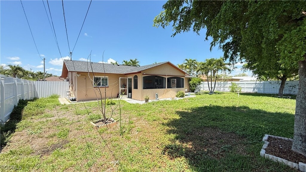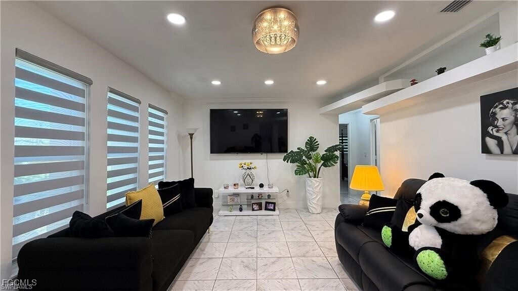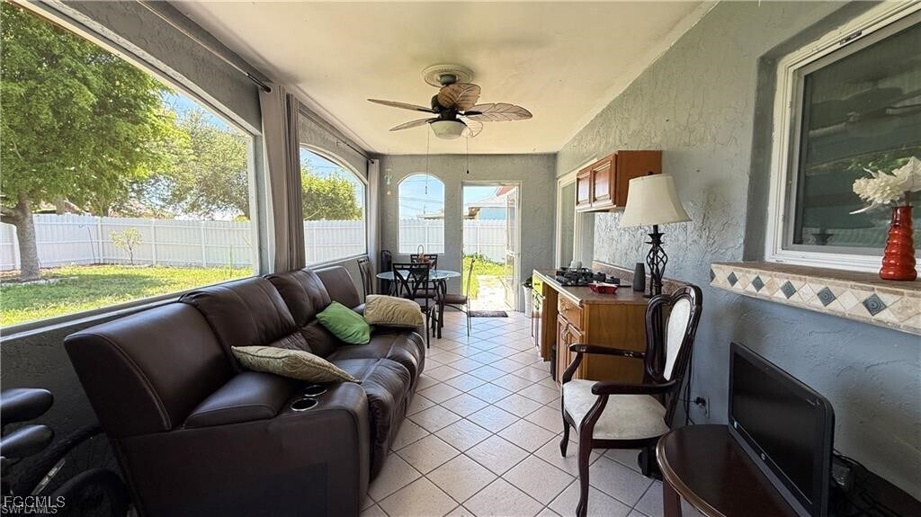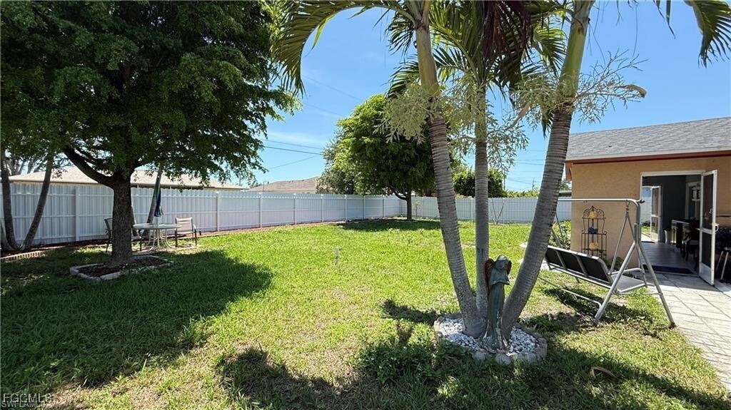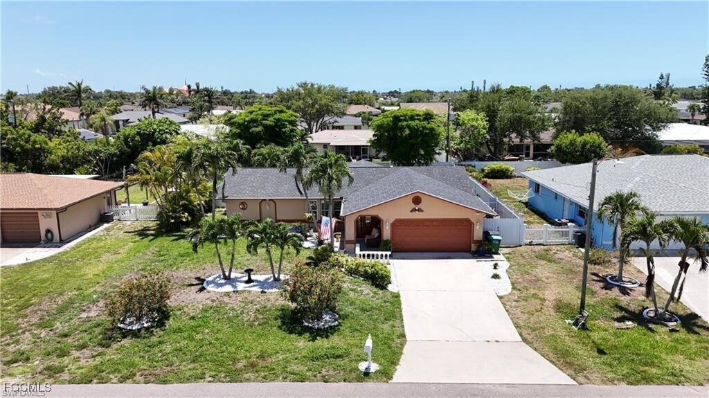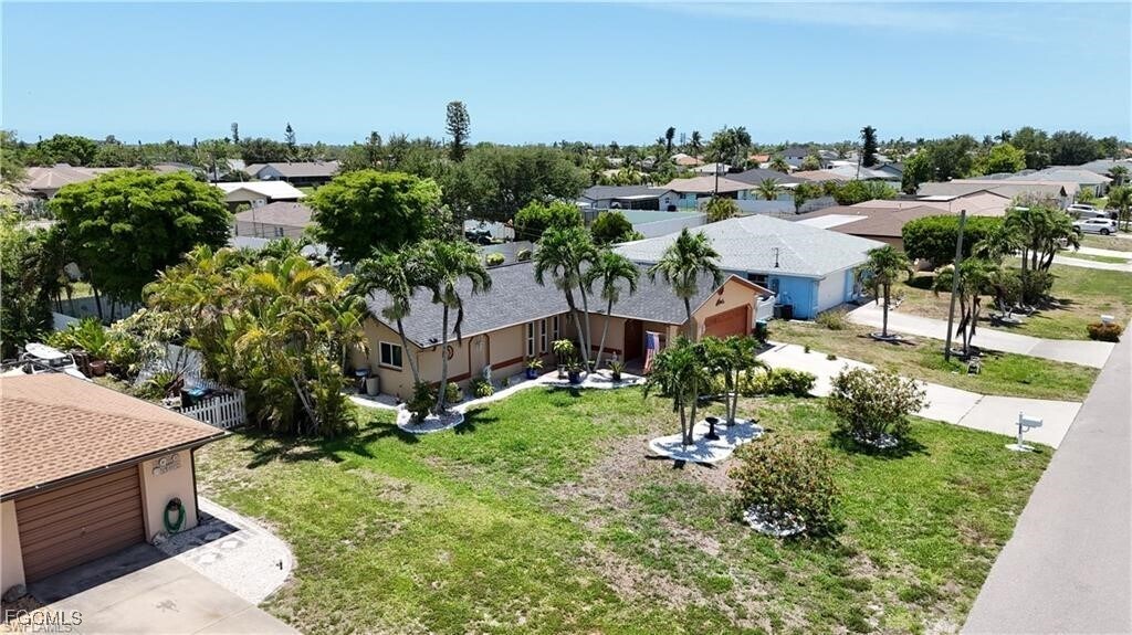 Welcome to this beautifully updated home located in one of Cape Coral’s most desirable neighborhoods,just minutes from Downtown,top-rated schools,fitness centers,shopping,dining,and beaches. This property Surrounded by different beautiful types of palm trees,and the outdoor space offers a true taste of Florida living,this home offers unparalleled convenience and lifestyle. This property is Not in a FEMA AE Flood Zone and has city utility assessments fully paid. Recent upgrades include a new roof (2023),new fencing (2023),impact doors and windows (2020),central A/C (2014) and a new water heater (2024).The home boasts modern finishes throughout,crown molding,elegant porcelain and wood flooring,TV is staying,and stainless steel appliances (excluding the dishwasher is not working).The lanai is fully screened,featuring a spacious layout and a mini outdoor kitchen,perfect for entertaining. The expansive,newly fenced backyard (2023) offers ample space for a pool,creating your own private oasis. Don't miss the opportunity to own this move-in-ready home that combines comfort,location,and potential.