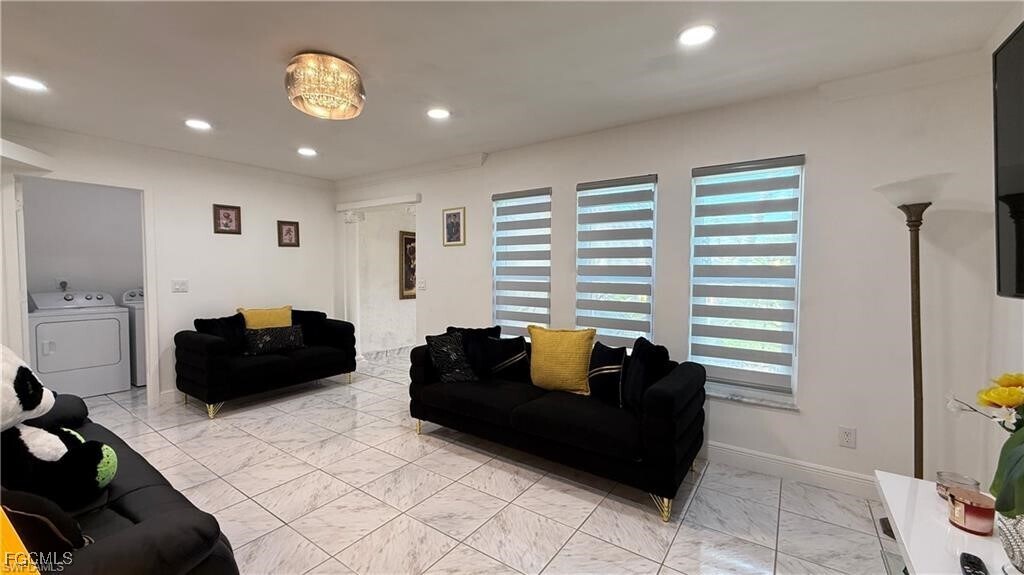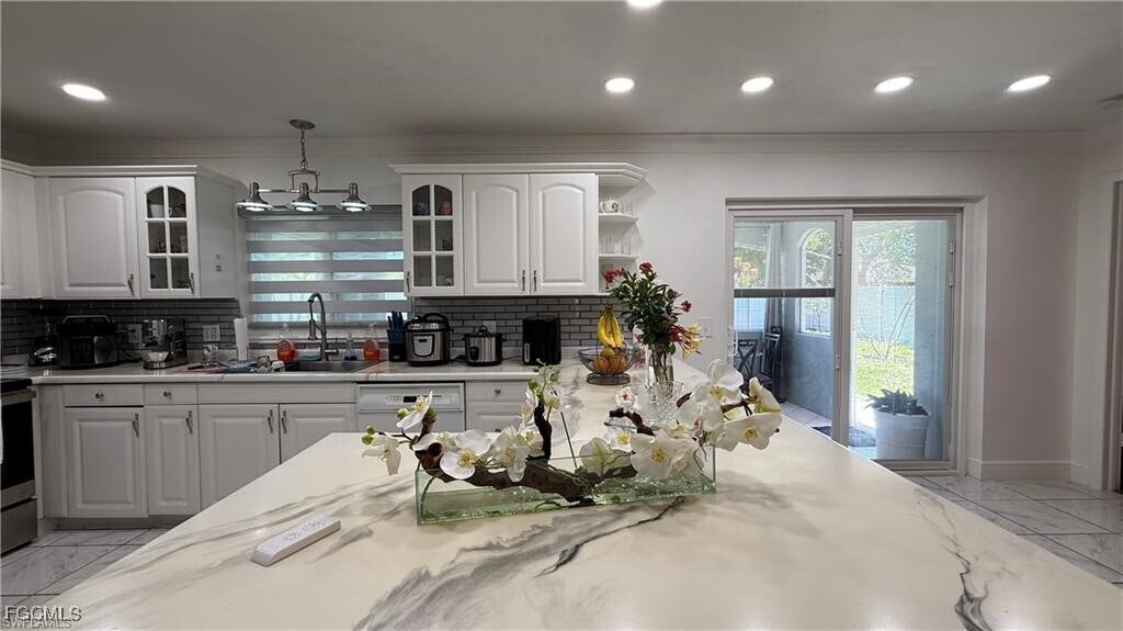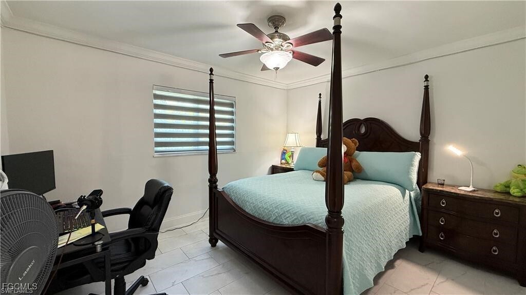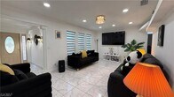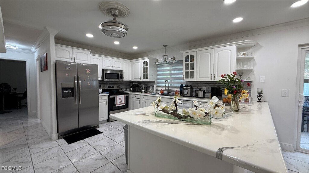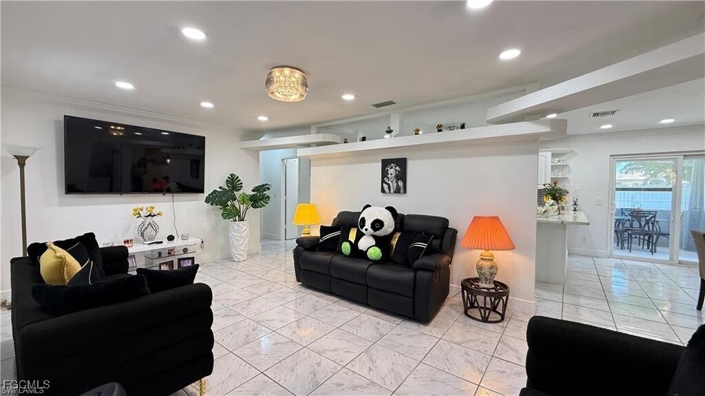 Welcome to this beautifully updated home located in one of Cape Coral’s most desirable neighborhoods,just minutes from Downtown,top-rated schools,fitness centers,shopping,dining,and beaches. This property Surrounded by different beautiful types of palm trees,and the outdoor space offers a true taste of Florida living,this home offers unparalleled convenience and lifestyle. This property is Not in a FEMA AE Flood Zone and has city utility assessments fully paid. Recent upgrades include a new roof (2023),new fencing (2023),impact doors and windows (2020),central A/C (2014) and a new water heater (2024).The home boasts modern finishes throughout,crown molding,elegant porcelain and wood flooring,TV is staying,and stainless steel appliances (excluding the dishwasher is not working).The lanai is fully screened,featuring a spacious layout and a mini outdoor kitchen,perfect for entertaining. The expansive,newly fenced backyard (2023) offers ample space for a pool,creating your own private oasis. Don't miss the opportunity to own this move-in-ready home that combines comfort,location,and potential.