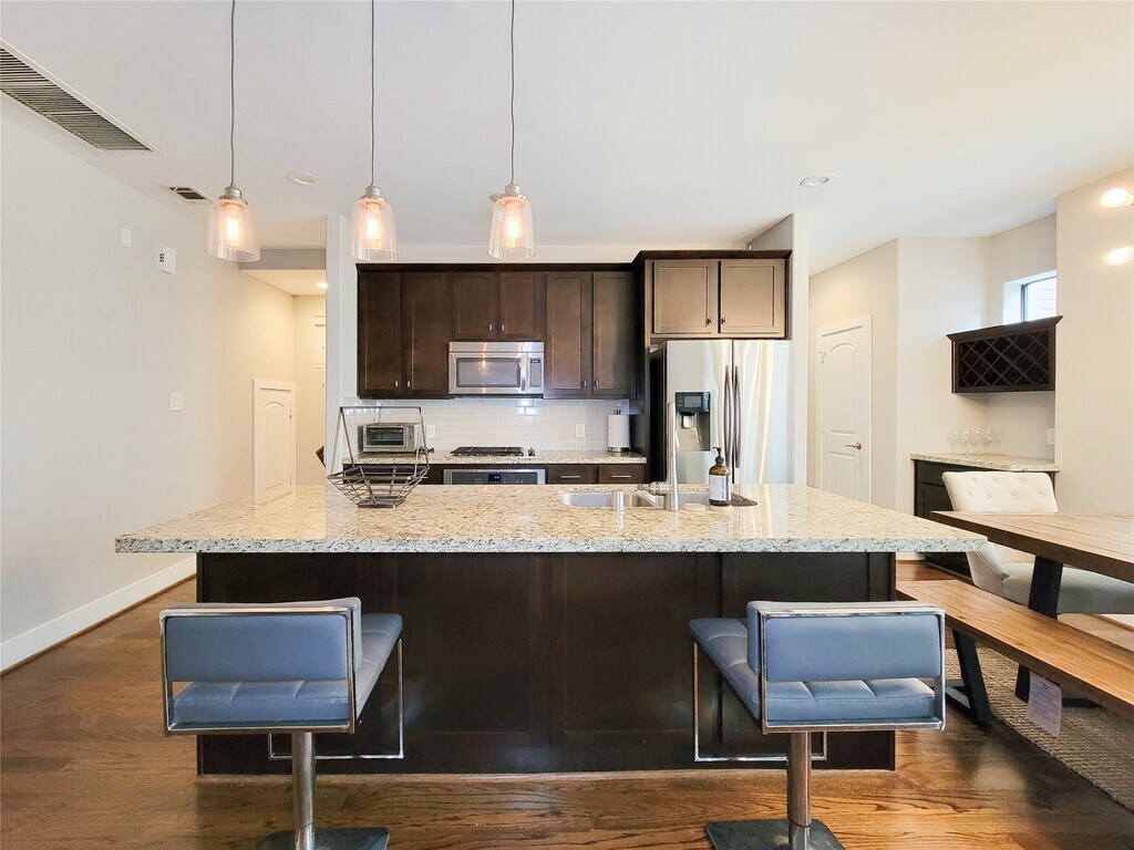 This property is Furnished and ready for move-in. The exterior combines brick,stucco,cement board,and stone on a slab foundation,with an automatic driveway gate and attached one-car garage. Outdoor areas include a fenced backyard and balcony. Inside,an open-concept layout features wood,tile,and carpet flooring,high ceilings,a gas-log fireplace,and a modern kitchen with island,breakfast bar,and granite countertops. Energy-efficient details include low-E windows,HVAC =13 SEER,radiant barrier,ceiling fans,and a programmable thermostat. Utilities include public water and sewer,plus safety systems such as an owned alarm,smoke/fire alarms,and attic vents. Blending modern design,energy efficiency,and thoughtful features,this townhome-style residence delivers a polished urban living experience in Midtown???????????????????????????????? Houston. MLS# 21929431