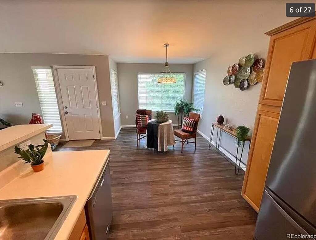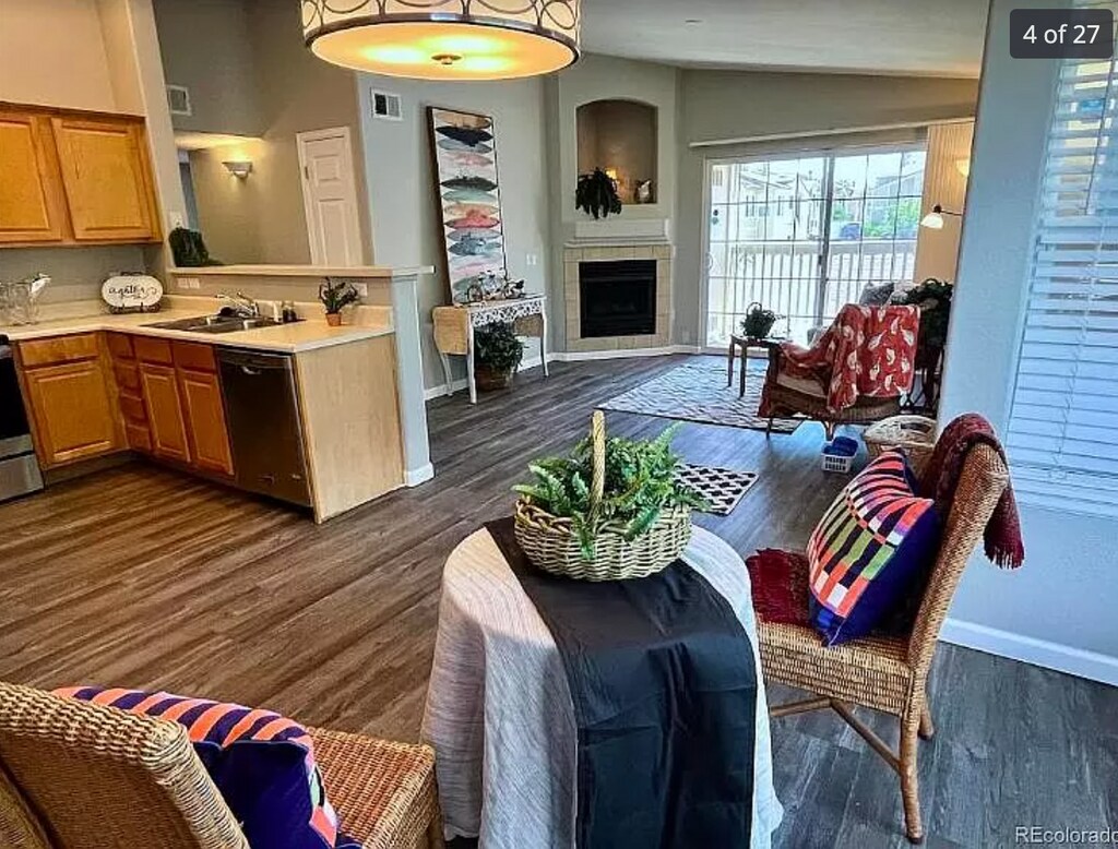 Welcome to Pinnacle Ranch, a quiet gated community in the desirable Dayton Triangle neighborhood of Aurora! This immaculate 2-bedroom, 2-bathroom condo offers the perfect blend of comfort, convenience, and modern updates. One of the larger second-floor units, it features high ceilings, a cozy fireplace, and an open-concept layout that seamlessly connects the living room, dining nook, and kitchen. Step out onto your private balcony to enjoy your morning coffee or unwind in the fresh air. The primary suite features a walk-in closet with built-in shelving and a private en-suite bathroom with dual vanities, while the second bedroom has its own full bath conveniently located across the hall perfect for guests, family, or a home office. Recent upgrades include: NEW luxury vinyl tile flooring NEW carpet NEW stainless steel appliances Fresh, contemporary paint colors In-unit washer and dryer (included) Enjoy two parking options a detached 1-car garage plus an additional reserved space near the unit. Community amenities include a pool, hot tub, fitness center, clubhouse, and well-kept green spaces for outdoor relaxation. Neighborhood & transit: Minutes to everyday essentials Costco, Target, Sprouts, King Soopers, dining, and cafes. Quick access to I-225 and major corridors- ~20 minutes to Downtown Denver and convenient to Anschutz, DTC, and Cherry Creek.