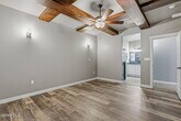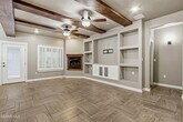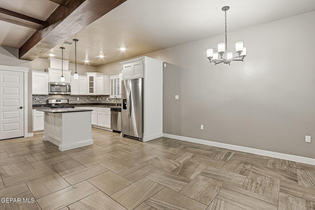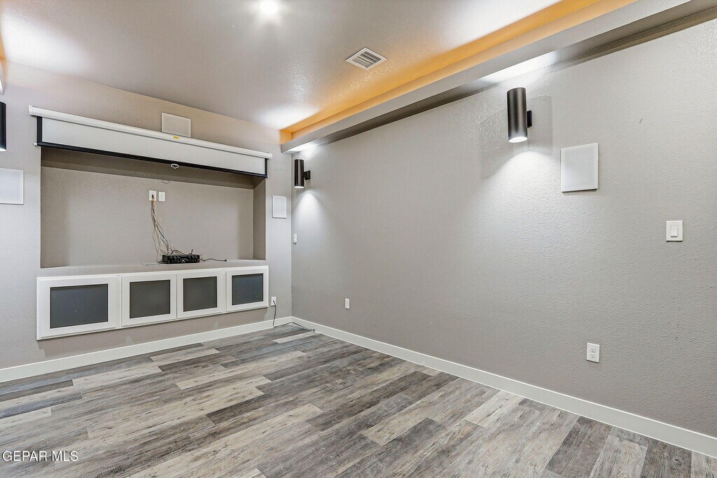 Beautiful open-concept design seamlessly connects the kitchen,dining,and family room,creating an ideal space for everyday living and entertaining. A dedicated theatre room is always a hit with friends and family—perfect for movie nights or game days. The primary suite offers the comfort and upgrades you've been searching for,featuring granite countertops,a spacious walk-in closet,and ceiling beams,among other thoughtful touches. Two additional bedrooms showcase accent walls and tall ceilings,adding both character and a sense of openness. The front yard is fully landscaped,while the backyard features a large covered patio,ideal for relaxing or entertaining.