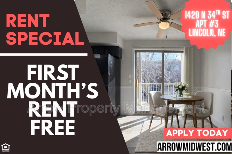Welcome to 1429 N 34 apartment #3, our modern 1 bedroom, 1 bathroom apartment located in the heart of Lincoln, NE. This pet-friendly unit features secured entry access for added peace of mind. Enjoy the convenience of shared laundry facilities right on-site. With modern updates throughout, this apartment offers a comfortable and stylish living space. Located just across the street from East Campus, you'll have easy access to all the amenities the area has to offer. Off-street parking is also available for your convenience. Don't miss out on this fantastic opportunity to call this apartment home! Visit to apply and schedule a showing. Additional information- Pets negotiable with a $150 non-refundable pet deposit and monthly fee per pet. Unlimited laundry use at $10/month per tenant and Shared Utility Fee at $28/month per tenant. All Arrow Property Management residents are enrolled in the Resident Benefits Package (RBP) for $30.00/month which includes liability insurance, credit building to help boost the resident’s credit score with timely rent payments, our best-in-class resident rewards program, and much more! More details upon application. Amenities: dishwasher, balcony, ceiling fans, luxury vinyl flooring