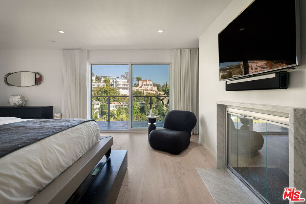 This chic, contemporary residence delivers the ultimate Hollywood Hills lifestyle, blending striking architecture with panoramic views. Spanning two dramatic levels, walls of glass open to expansive outdoor decks, creating effortless indoor/outdoor living and a true connection to the surrounding landscape. City lights and canyon vistas unfold from every room, offering a front-row seat to Los Angeles. As night falls, enjoy a daily light show of twinkling city lights and the iconic glow of Sunset Boulevard below - an unmistakable Hollywood Hills experience. Designed for easy elegance, the home features soaring vaulted ceilings and an open-concept living and dining space anchored by a sleek, modern kitchen with an oversized breakfast bar - ideal for entertaining. The luxurious primary suite is a private retreat, complete with a cozy fireplace and spa-like bath. A generous second bedroom includes an en-suite bath, while a flexible third space functions perfectly as a bedroom, office, or den. AVAILABLE FULLY FURNISHED FOR $12,000 PER MONTH. MLS# 26650585