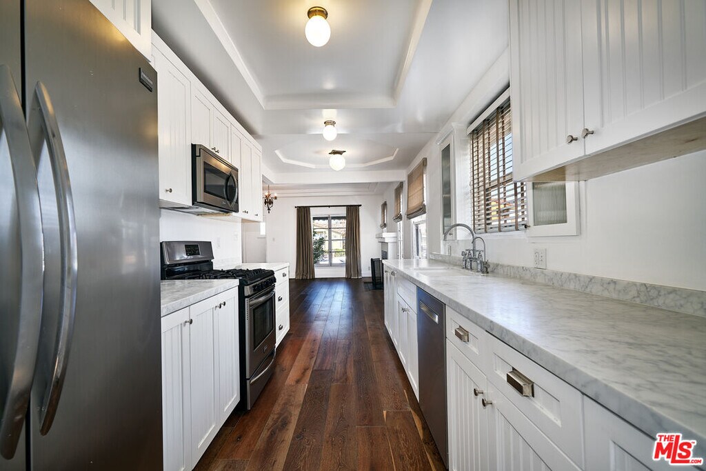 Fully remodeled by BetterShelter, this beautiful Spanish 3BR/2BA maintains all of its original charm, while still providing the comforts of a meticulous, modern reimagining! Enter the airy, open living room, complete with wide-plank oak floors, custom linen drapes, and a charming, decorative fireplace. The bright kitchen boasts stainless appliances, Carrara marble counters, and a separate laundry room with an abundance of storage and pantry space. The primary suite features dual closets, custom drapes, and a delightful ensuite bathroom. A guest bathroom and two additional guest bedrooms, each with French doors to the backyard and deck, round out the fabulous floor plan. Enjoy year-round entertaining and relaxing in the private, lush backyard, with its shady trees and grassy yard. The spacious and partially finished garage would make an excellent space for a home gym, bonus storage, or an office. Enjoy excellent proximity to Joe's Pizza, Bloom Cafe, Paper & Plastic, Sky's Tacos, LACMA, The Grove, and the 10 freeway. MLS# 26661405