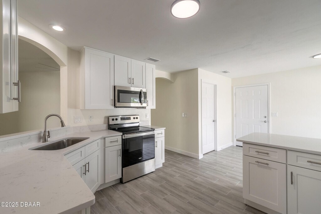 Stunning Florida Shores Rental! Fully renovated 4BR/2BA home featuring gray plank tile throughout,modern fixtures,and fresh paint inside and out. Gorgeous kitchen with soft-close shaker cabinets,quartz countertops,and stainless-steel appliances. Bathrooms showcase marble tile showers with mosaic accents and quartz vanities. Enjoy a spacious fenced yard,oversized lanai,and 2-car garage with epoxy floors. Move-in ready!