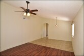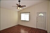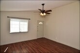Spacious three-bedroom,two-bathroom residence designed for comfortable living. This home welcomes you with a delightful covered front porch,leading into an airy interior adorned with stylish laminate flooring. The heart of the home is the great room,featuring a handsome fireplace and plenty of space for both entertaining and daily life. The adjoining kitchen impresses with its sleek stainless appliances,abundant counter space,and a practical breakfast bar. The master bedroom is a generous retreat,easily accommodating a king-sized bed and featuring a large walk-in closet. The two additional bedrooms are bright and versatile,perfect for family,a home office,or guests. The huge,privacy-fenced backyard is an incredible asset,offering endless possibilities for recreation and relaxation. This move-in-ready gem perfectly balances practicality and charm. Deposit-Free Renting service to Obligo qualified renters,fees may apply.