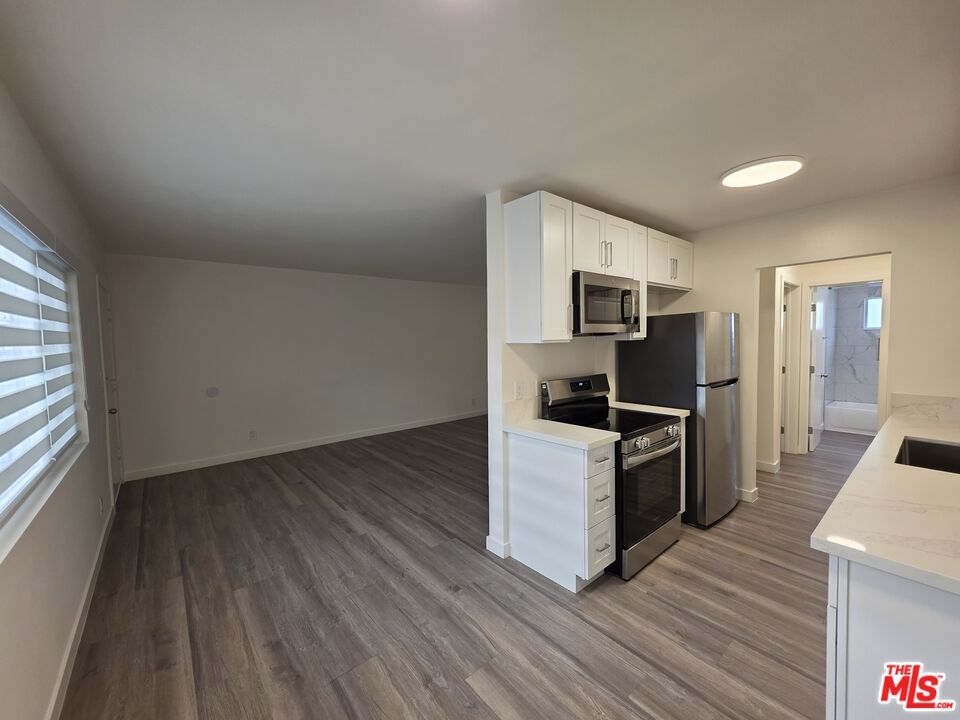 Beautifully renovated 1-bedroom, 1-bath ground-floor unit located in prime West Los Angeles near UCLA. This bright and spacious home features an open-concept living and dining area with wide-plank wood-style flooring, fresh modern finishes, and a large sliding glass door that opens to a private enclosed patio perfect for relaxing or entertaining. The updated kitchen offers white shaker cabinetry, quartz countertops, stainless steel appliances, and ample storage space. The bedroom is generously sized with great natural light and convenient access to the upgraded bathroom featuring a glass-enclosed shower/tub combo and clean contemporary finishes. Enjoy the privacy and convenience of ground-floor living with easy access. Ideally situated near UCLA, Westwood Village, shopping, dining, and major freeways. A fantastic opportunity to live in one of LA's most desirable neighborhoods. The listing price include a parking fee of $100 per month. MLS# 26665643