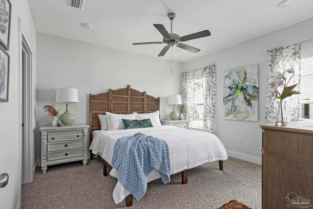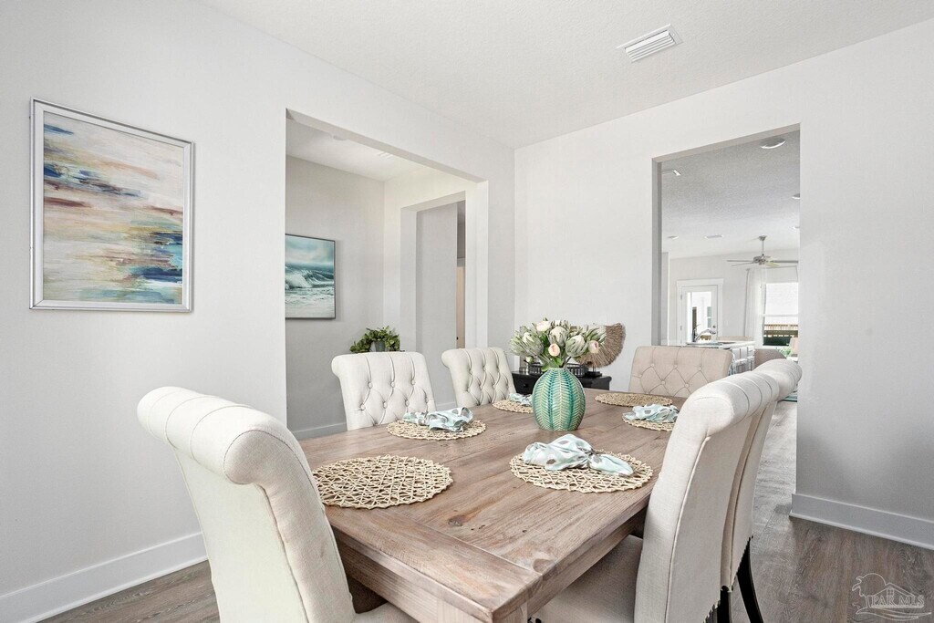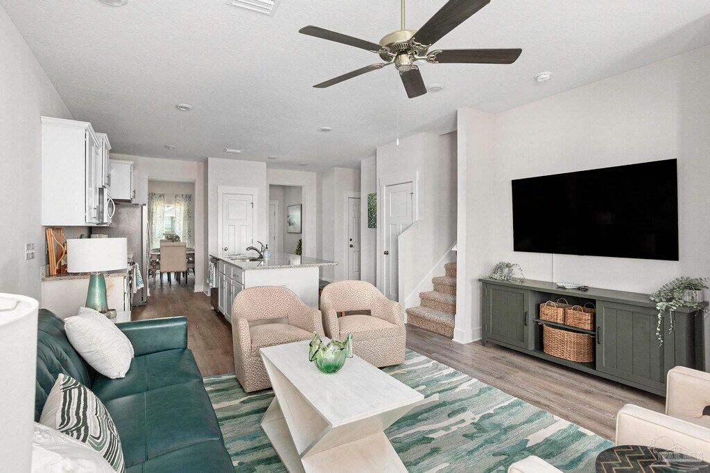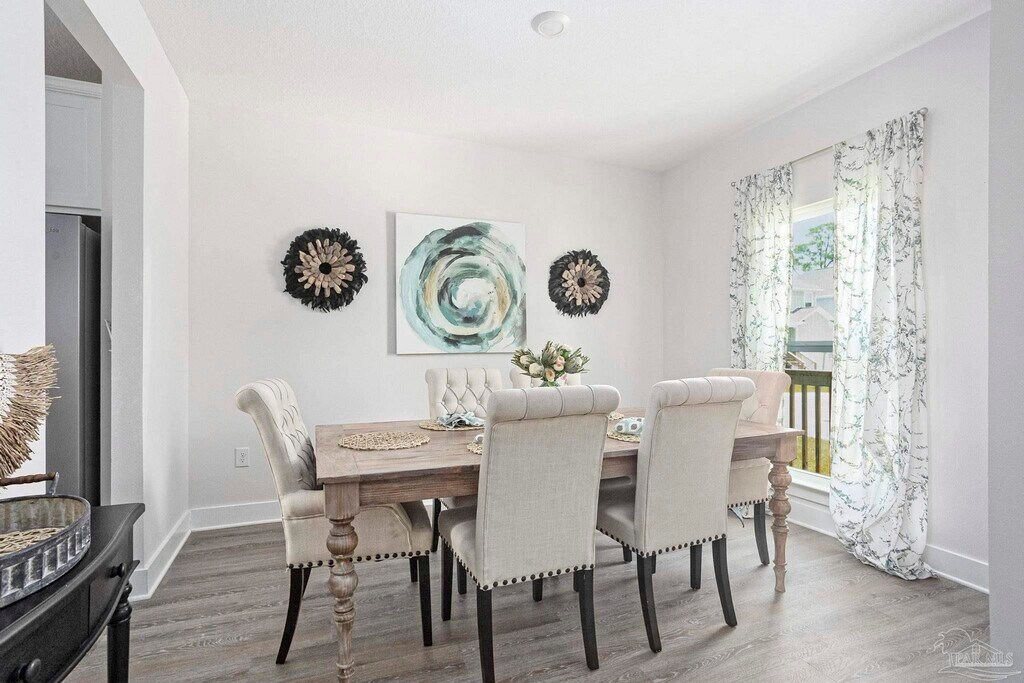 Built in 2022,this beautifully maintained 4-bedroom,3.5-bath home offers a fantastic blend of modern design and coastal charm. With two spacious living areas,there's room for everyone to spread out and relax. You'll love the light wood-look LVP flooring throughout the main spaces,complemented by cozy carpeting in the bedrooms and second living area. The kitchen is a dream — featuring stainless steel appliances,sleek granite countertops,stylish white cabinetry,and a large island with breakfast bar seating. A formal dining room flows directly into the kitchen,making it ideal for entertaining. The spacious master suite is filled with natural light and boasts a luxurious ensuite bathroom with double granite vanities and a glass-enclosed standing shower. Enjoy year-round outdoor living on the covered back patio,offering plenty of room for an al fresco dining area. Built for peace of mind,this home includes hurricane protection features like double-pane windows,insulated ceilings,durable Hardiplank siding,and fabric shutters ready for quick installation. Plus,with newer major components like the roof,HVAC,and hot water heater,you can move in with confidence.