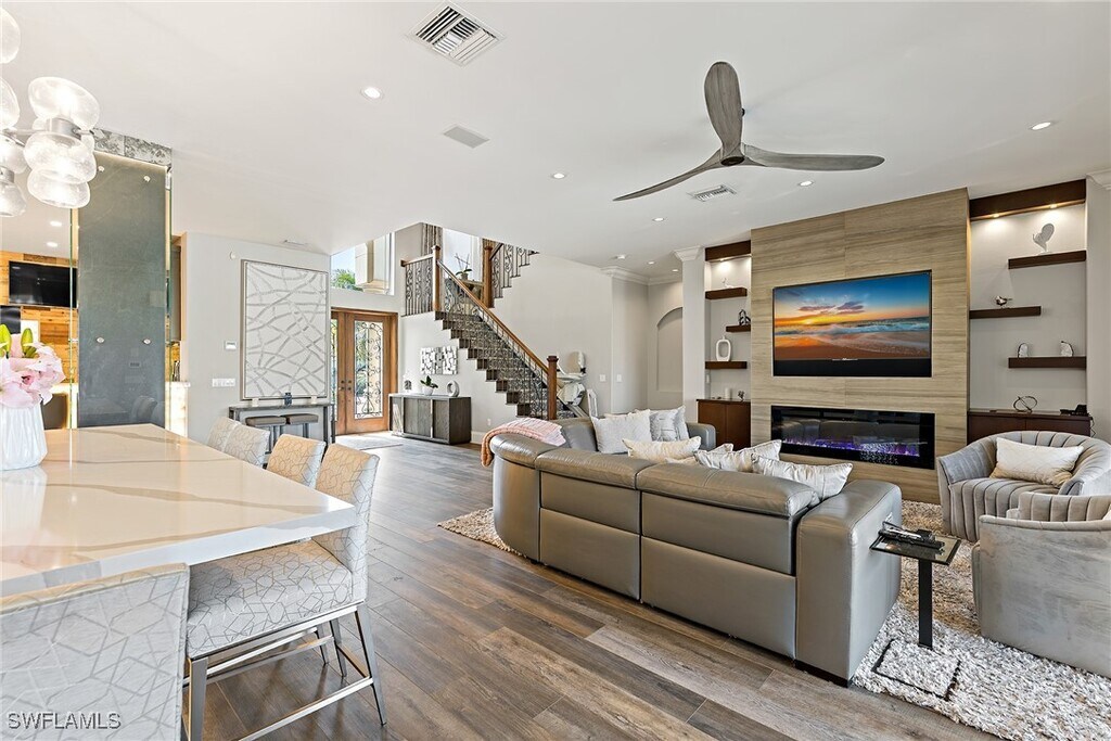 Available Annually ($15,000/month) and Seasonally ($32,000/month). Located in the prestigious waterfront community of Golden Shores in Naples,this exquisite 4 bedroom plus den,4 bath home is the perfect annual rental for those seeking luxury and comfort. The open concept living area is flooded with natural light,featuring a cozy wall fireplace,elegant LVF floors,and a spacious sectional ideal for relaxing or entertaining. The gourmet kitchen is a chef’s dream,complete with Sub-Zero refrigerator,GE Monogram induction cooktop,dual islands,quartz countertops,double wall ovens,a built-in coffee machine,and counter-height seating. A separate dining area boasts a 250-bottle wine cooler,perfect for hosting dinners with family and friends. Entertain in style at the stunning wet bar with designer lighting and chic bar stools. The primary suite offers a king-sized bed,dramatic coffered ceilings,and an oversized custom walk-in closet. The spa-like primary bath features a double vanity,vanity desk,soaking tub,and walk-in shower,creating the ultimate retreat. Upstairs,guests enjoy spacious accommodations,two rooms with full-sized beds and one with a queen bed,along with a family room featuring a large leather sectional,poker table,and big-screen TV. A dedicated media room with multi-level oversized seating provides the perfect space for movie nights or relaxation. Just outside is an unparalleled outdoor living space with a resort-style pool complete with a slide and spa,plus a full outdoor kitchen and bar overlooking the canal with direct Gulf access. The home also includes a boat dock and a 30K boat lift,ideal for boating enthusiasts. Residents of Golden Shores enjoy a lifestyle of convenience and charm,with nearby access to pristine white sandy beaches,local events,scenic trails,and the shops and restaurants of 5th Avenue or 3rd Street. Live exceptionally in Golden Shores!