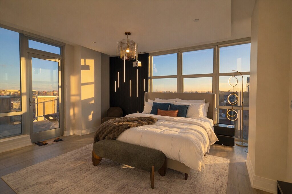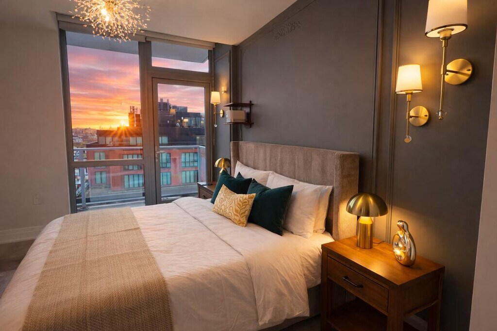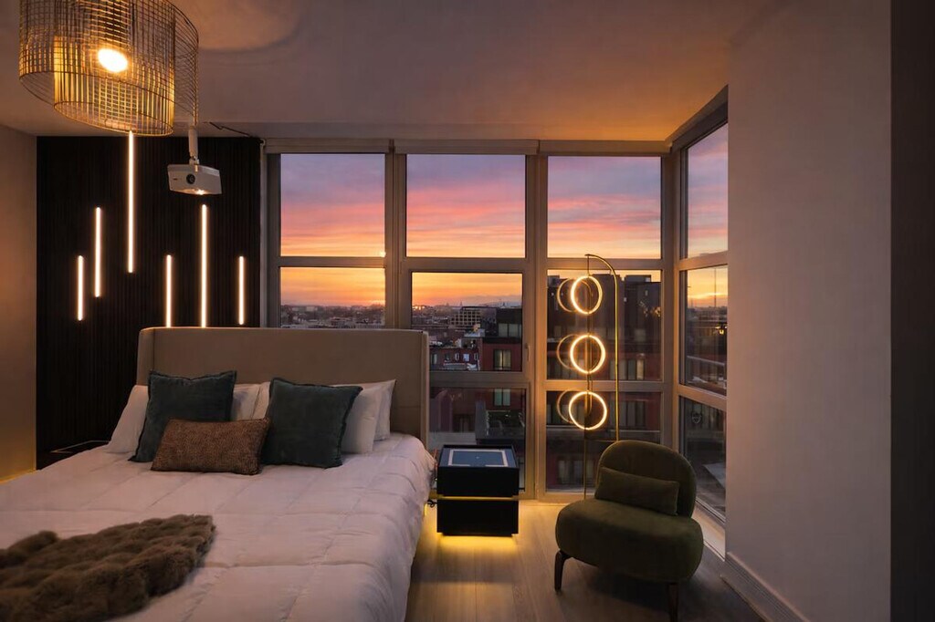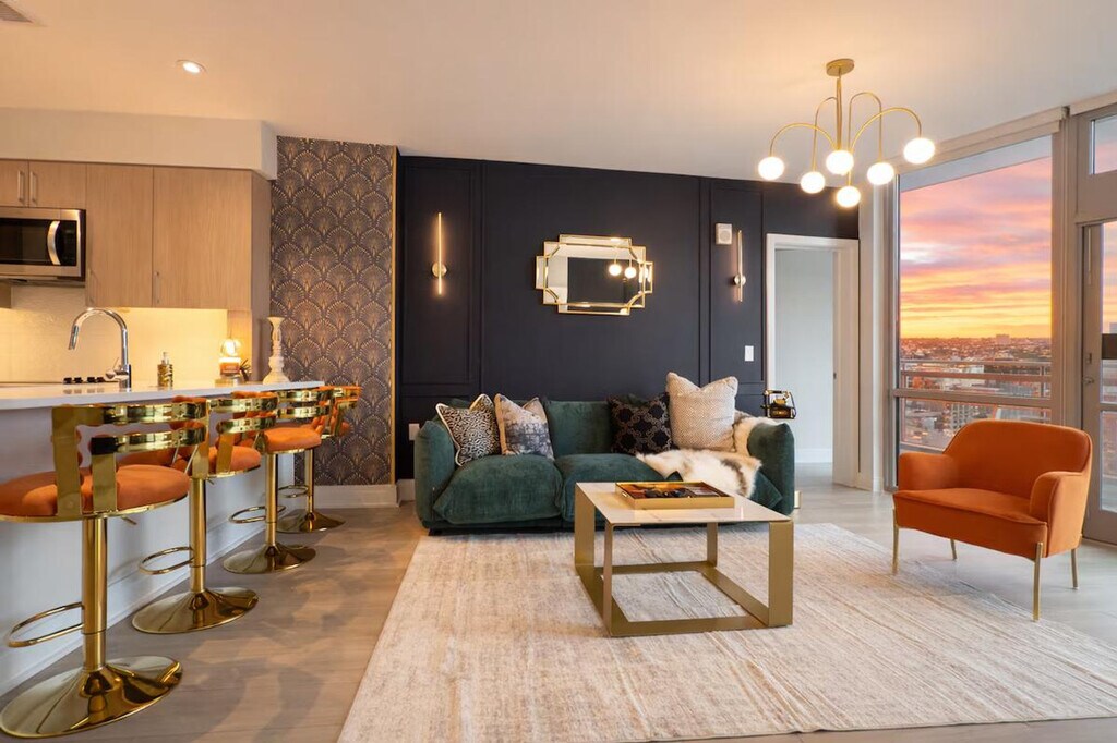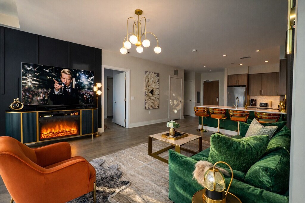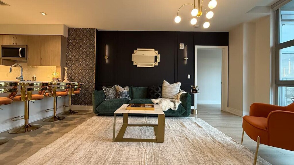 Feel at home in this designer apartment in DC, created for Gatsby lovers. This is a place for slowing down. Every detail is intentional, from the sculptural lighting and deep textures to the gold accents. A private projector turns nights into an experience. The mood shifts as the sun sets, and the space changes with it. It’s quiet, cinematic, and personal. Public parking is available; check SpotHero. Pets are welcome for an extra fee. This apartment is composed rather than just furnished. Before your arrival, you will receive a link with all the instructions you need. Please be sure to contact me before you arrive if you have not received it. [SI]