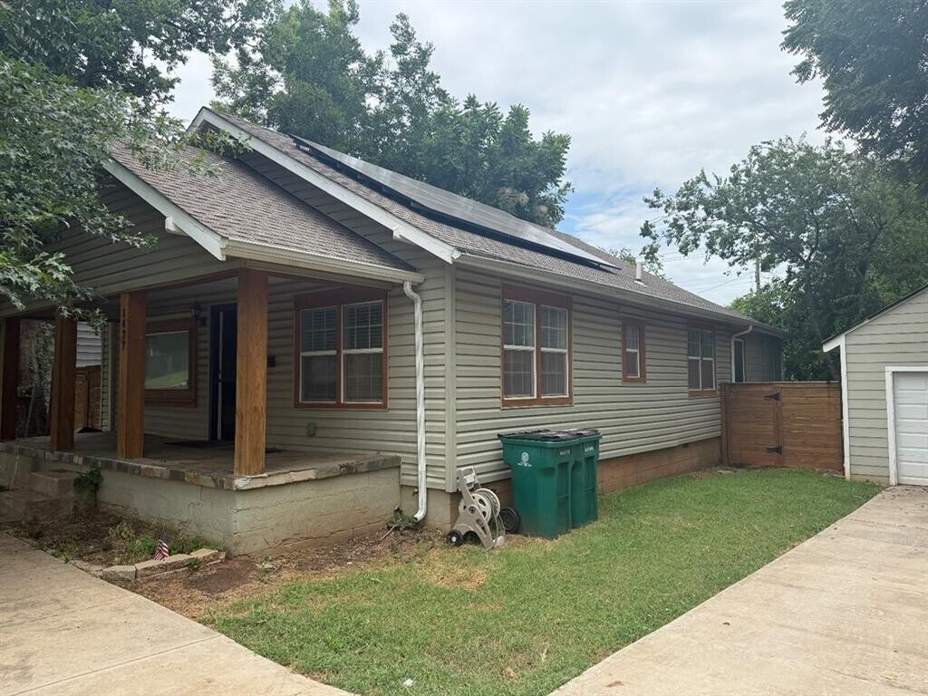 Step into timeless charm with modern updates in this beautifully remodeled 3-bedroom,2-bathroom home,originally built in 1948. Thoughtfully expanded,the primary suite now features a spacious en-suite bathroom and a generous walk-in closet—offering both comfort and convenience. Gorgeous hardwood floors flow throughout the home,complementing the inviting living space with a cozy fireplace. The kitchen comes fully equipped with a refrigerator,dishwasher,and microwave,making it move-in ready. Energy-efficient solar panels,AT&T Fiber internet,and total electric service add to the home's modern appeal. Enjoy your morning coffee on the welcoming front porch or host friends on the backyard deck—ideal for entertaining. A detached one-car garage adds practical storage and parking. Located just minutes from Downtown OKC and OU Health Center with quick access to I-35 and I-235,this home is perfectly situated for professionals and commuters alike.