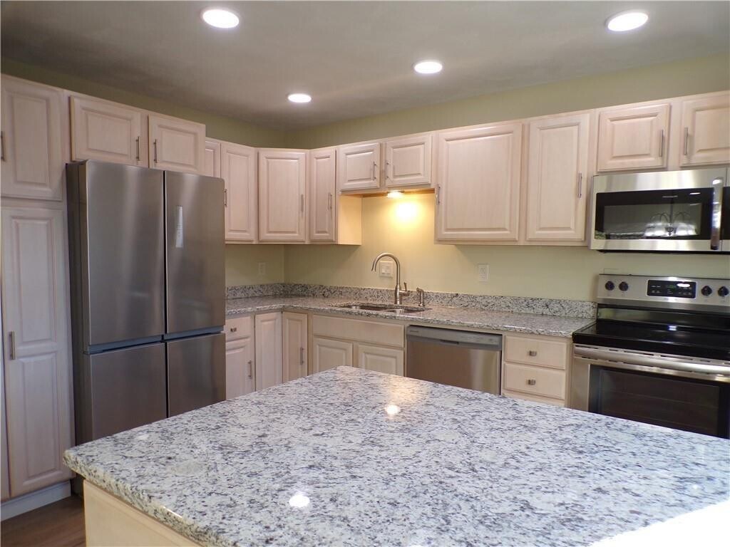 Open floor plan second floor condo with 2 beds,2 bathrooms is available for rent. Spacious,airy and bright describes this lovely condo. Access to this condominium is located through the private front entrance or garage. From the entrance throughout the second floor this condo presents pleasing color palate. On the first floor you will find a large closet,laundry room and an oversized garage with plenty of storage. Carpeted stairs bring you to the living area on the second floor. Observe the high-quality laminate flooring throughout the living room,dining area and kitchen. Distinctive kitchen includes granite counter tops,peninsula for extra counter space/ stools,and plenty of cabinets with a generous size pantry cabinet. Kitchen is completed with 4 ½ years old stainless-steel appliances. Open floor plan allows plenty of space for your furniture. Large bow window,recessed lights & sliders to a private deck finish the living room. The primary bedroom is spacious in size with two closets and a primary bathroom. The second bedroom offers a large closet with access to the attic. Hallway bathroom was remolded December 2024 with new tile shower walls,newer fixtures. November 2022 both bathrooms remolded with vanities,granite countertops,sinks and toilets. This condo has it all with detail to quality and privacy galore. End your day on your private deck watching the sunset. Enjoy the amenities the community offers: Clubhouse,Gym,Pool,Pickleball & Tennis Courts. MLS ID 1404591