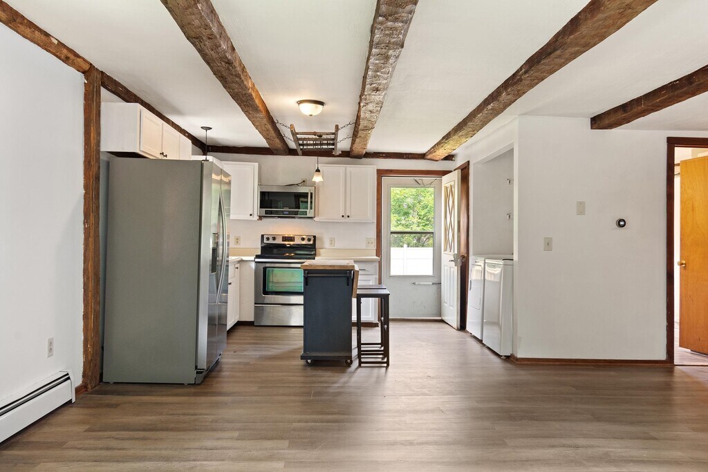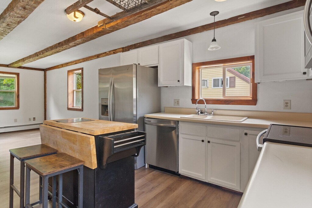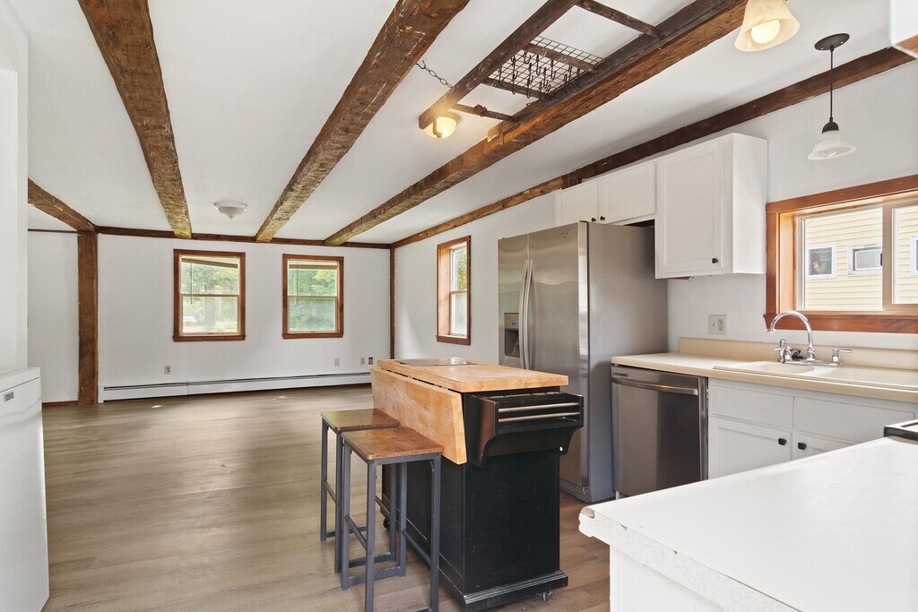 This year-round single-family rental offers the perfect blend of rustic charm and modern comfort. This 3-bedroom, 1-bath classic timber frame cape boasts a recently renovated bathroom with a custom tile shower with tandem shower heads, new flooring, fresh paint throughout & a refreshed kitchen with newer appliances. The open-concept living area creates a warm & inviting atmosphere. Kitchen/dining room, spacious pantry, two bedrooms downstairs, a huge lofted bedroom upstairs with additional room for storage & a back deck with a partially fenced yard. Enjoy the convenience of living just steps from Meredith's Child Park, 1.5 miles from the Lake Wicwas boat launch, 3.5 miles from Lake Waukewan Beach & boat launch, and 4.5 miles from Meredith's public docks & boat launch on Lake Winnipesaukee, as well as downtown Meredith, which features numerous shops, new restaurants, breweries, cafes & walking & hiking trails. No cats/reptiles. Dog under 60lbs considered and require additional fee. Tenant responsible for all utilities & $40 rental application fee required. Call owner to schedule (Agent interest) MLS# 5066385