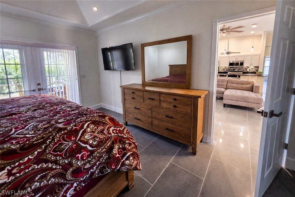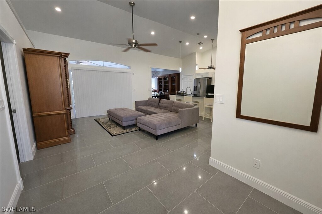 Welcome to 1440 Graham Cir in the highly sought-after Country Club Estates of Lehigh Acres. This beautifully renovated and tastefully furnished 3-bedroom plus den home is tucked away off Bell Blvd,offering a quieter setting within the community and exceptional privacy with a canal and mature trees behind the property. Situated on an oversized 0.26-acre lot,the home features approximately 1,767 square feet of living space with an open-concept layout,wood flooring in the main areas,cathedral ceilings,and elegant tray ceilings with crown molding in the primary bedroom and dining room. The spacious kitchen flows seamlessly into the living and formal dining areas and includes a breakfast bar ideal for entertaining. French doors from the primary suite and dining room lead to a large screened lanai,while an additional slider from the living room enhances indoor-outdoor living. Originally designed as a den with French doors and a bay window at the front of the home,this space has been converted into an additional bedroom to comfortably accommodate more guests of your own. The primary suite offers recessed lighting,ceiling fan,walk-in closet,large linen closet,and a private water closet. A built-in wall unit in the second bedroom provides convenient storage and media space. Additional features include a laundry room,a two-car garage with built-in cabinetry,newer roof,new carpeting,and a brick paver patio overlooking the peaceful canal.